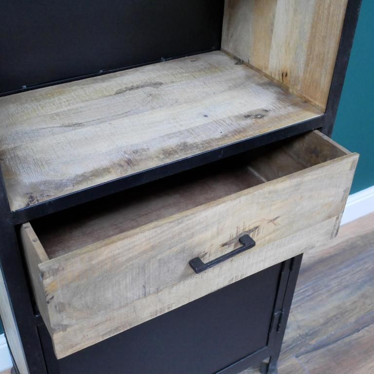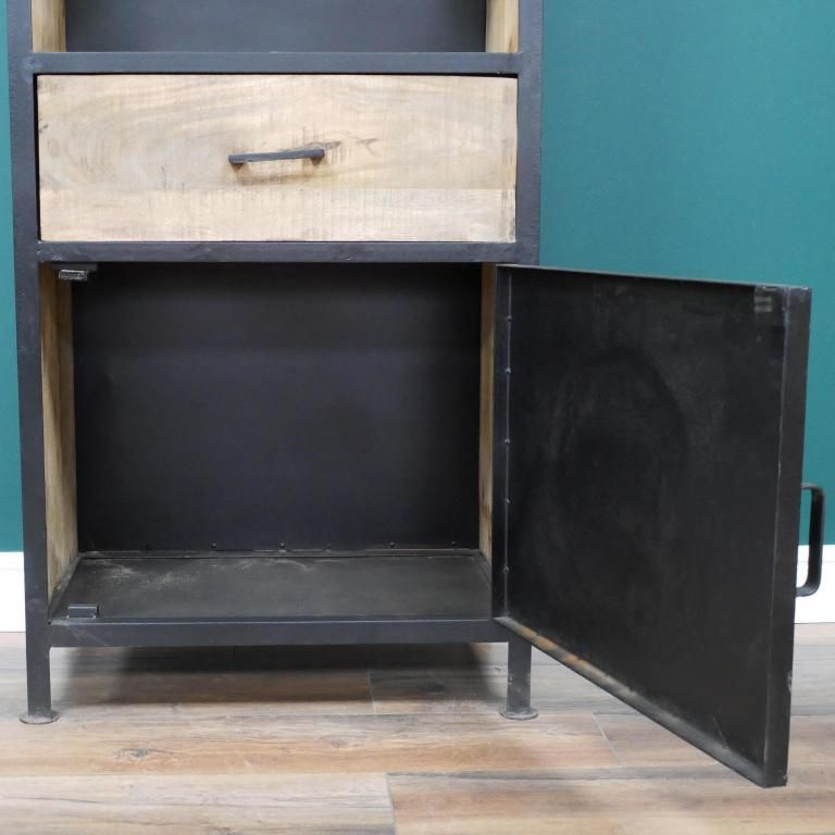 Crafted from a combination of wood and iron, this bookcase is ideal for any bookworm who is in the need of easy storage, without sacrificing too much space. The single-column design allows for a slim structure, whilst also offering three rows of shelves, a cupboard, and a drawer for additional storage. Featuring four integral legs to allow for maximum stability during use.