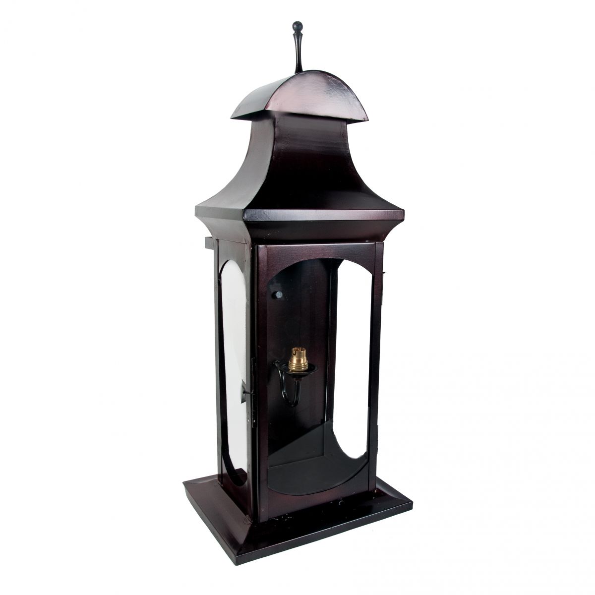 Charmingly classic in style with simple detailing and a regal design, this lantern has been specifically designed for wall mounting and is bound to add some flair to your exterior space. Finished in an elegant burnished burgundy, this lantern takes inspiration from classic Gothic design and is a wonderfully unique twist on more traditional options. This lantern comes complete with a solid brass bulb holder to ensure maximum light output. Finished with an antenna shaped finial, this authentically period design is an enchanting feature for your home and will cast a warm subtle glow over your grounds.
