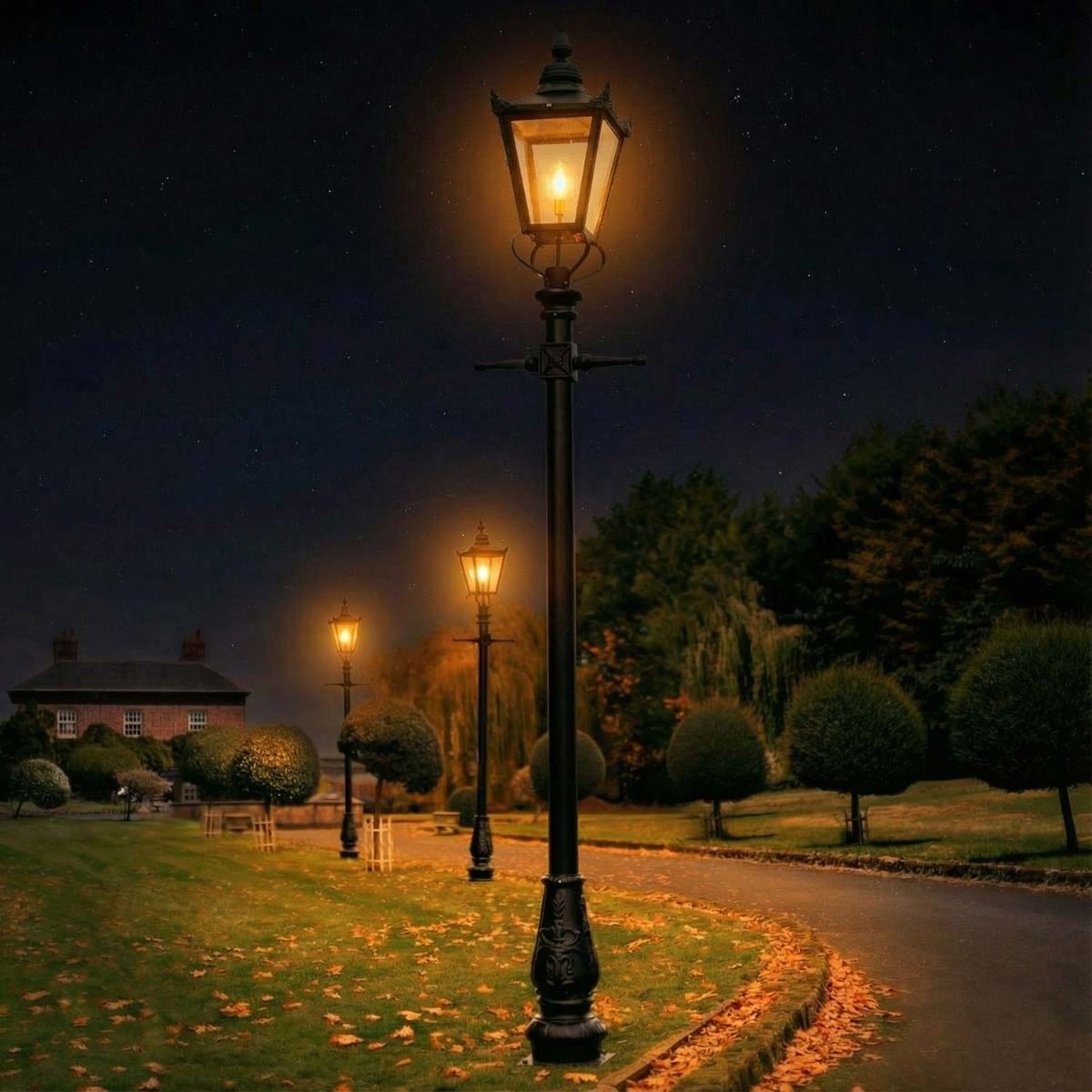 A faithful replica of traditional Victorian designs seen lining streets throughout history, this robust lamp post and lantern set is the ideal way to add period charm and ample light to any outdoor space. Finished in signal black, the lamp post itself has been crafted from a combination of robust cast iron and thick rolled steel whilst the supplied lantern head has been hand-formed from high-quality steel. Featuring authentic detailing throughout, this set comes complete with an ornate base, integral ladder bar, classic lantern shape, embossed corner finials and a tiered upper finial. Perfect for providing ambient illumination for your garden, grounds or driveway landscaping.