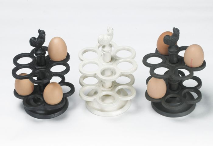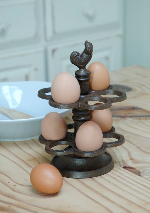 This cast iron egg holder is charmingly french in design and is finished in solid, natural Iron. Holds a dozen eggs.
