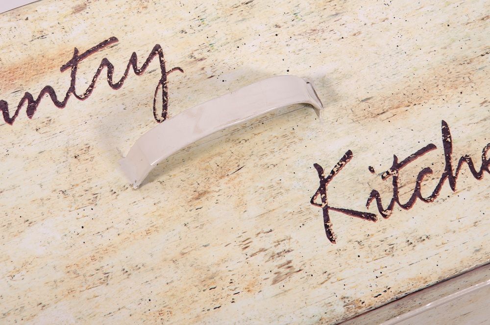 This is a charming set of kitchen tins, with an aged, vintage cream, decal, on hand made tin.The storage tins feature a large rooster as the main detail, beautifully painted in soft muted colours. These handy kitchen storage tins each have an integral handle at the top, and two extra handles at either side.The decoration also features the lettering ‘Country Kitchen’.
