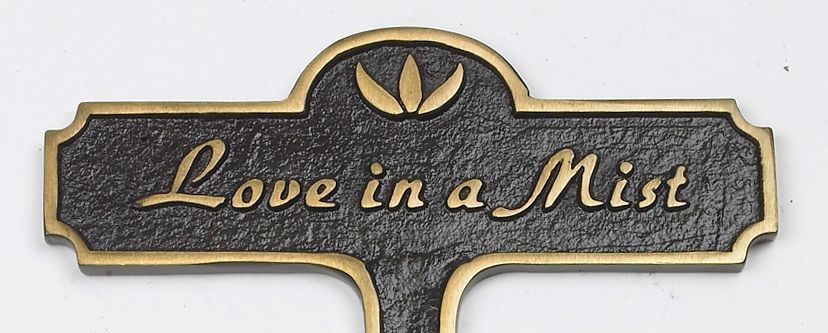 Love in a mist is made up of delicate petalled flowers in a striking cornflower blue. Use this label to signpost towards these plants in your planters or flower beds. Gold embossed lettering and a bold border make this a striking and easy to read sign that will add an elegant touch to your garden or outdoor space for many years to come.