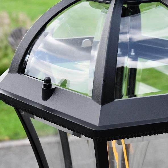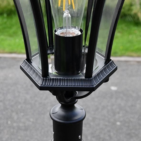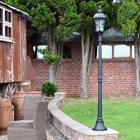 Finished in a sleek midnight black, this incredibly stylish lamp post pays homage to traditional Victorian design whilst simultaneously boasting a sense of contemporary styling. Expertly crafted from high-quality aluminium, this post comes complete with ridged detailing extending its frame and a unique hexagonal lantern head. The lantern takes direct inspiration from period design as seen through its curved shape, domed lid and tiered upper finial. Fitted with twelve integral panes of clear polycarbonate, this design will provide ample illumination for many years to come and is ideal for placement at an entryway or along a drive.