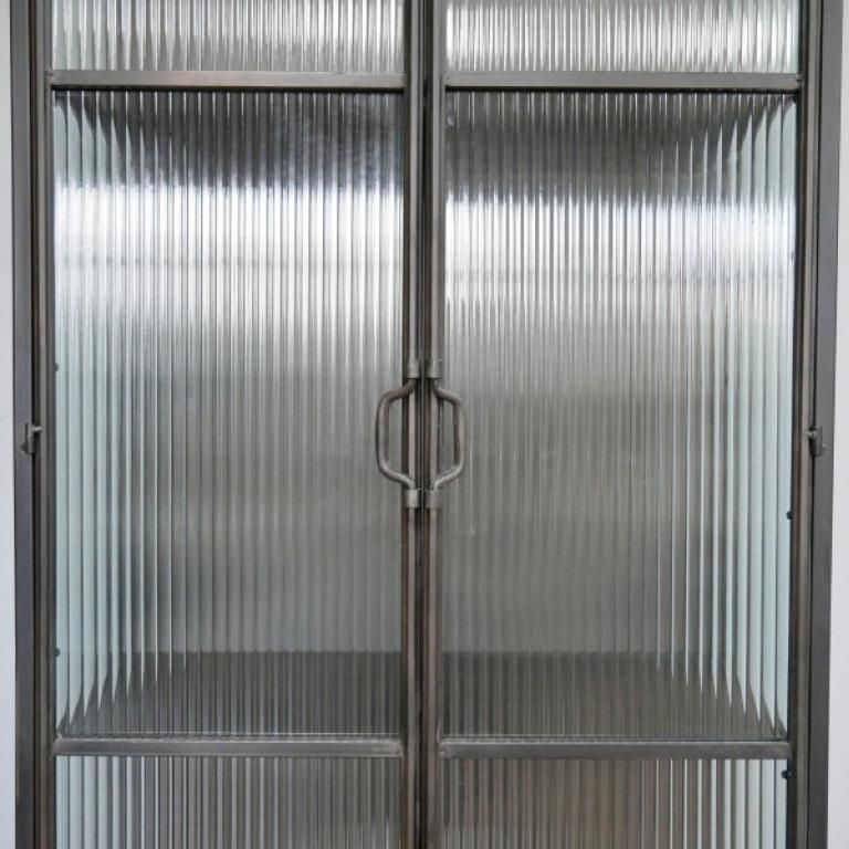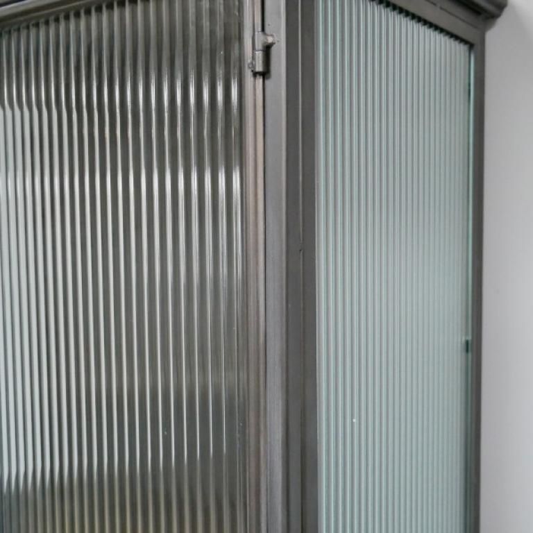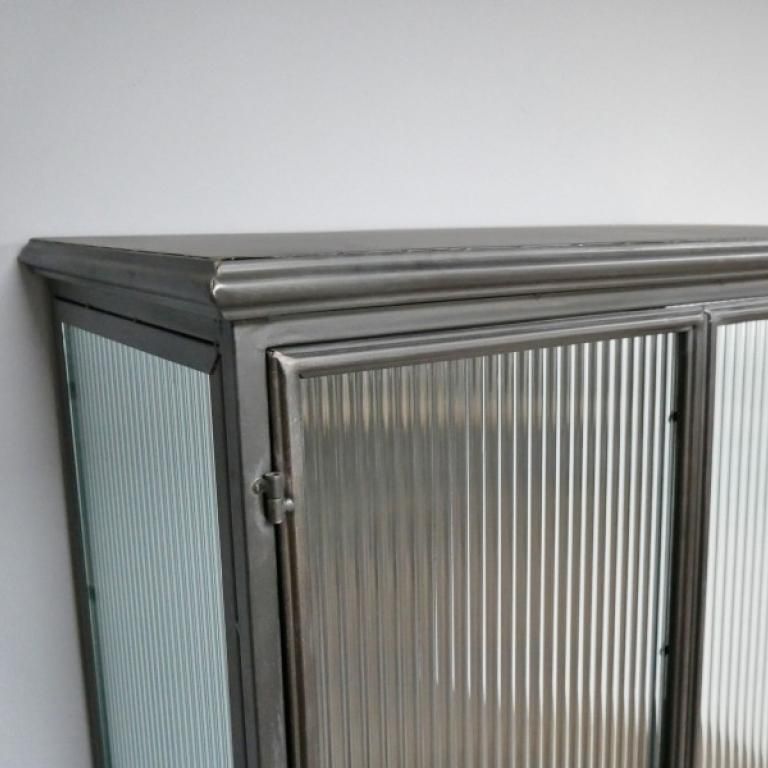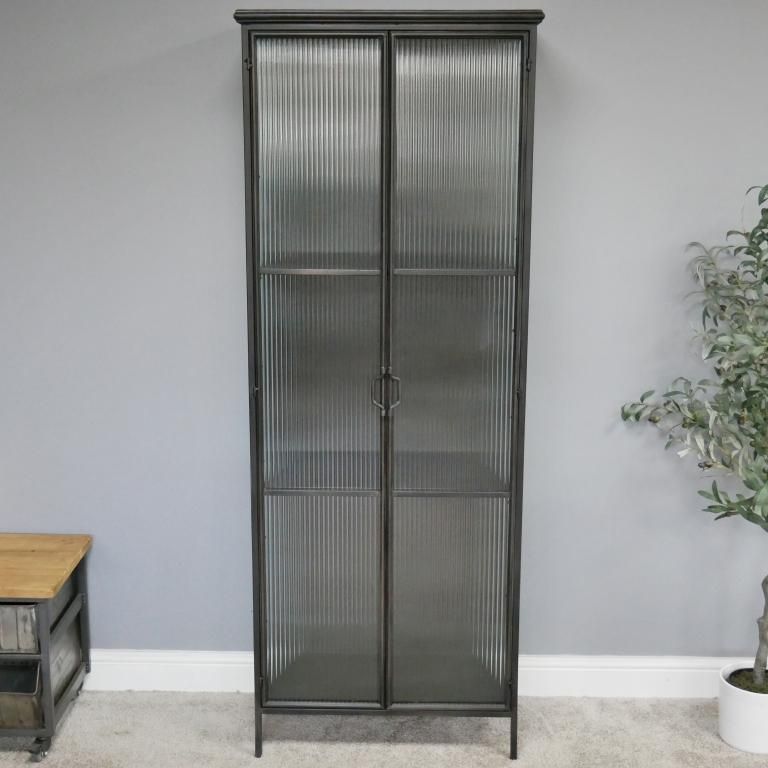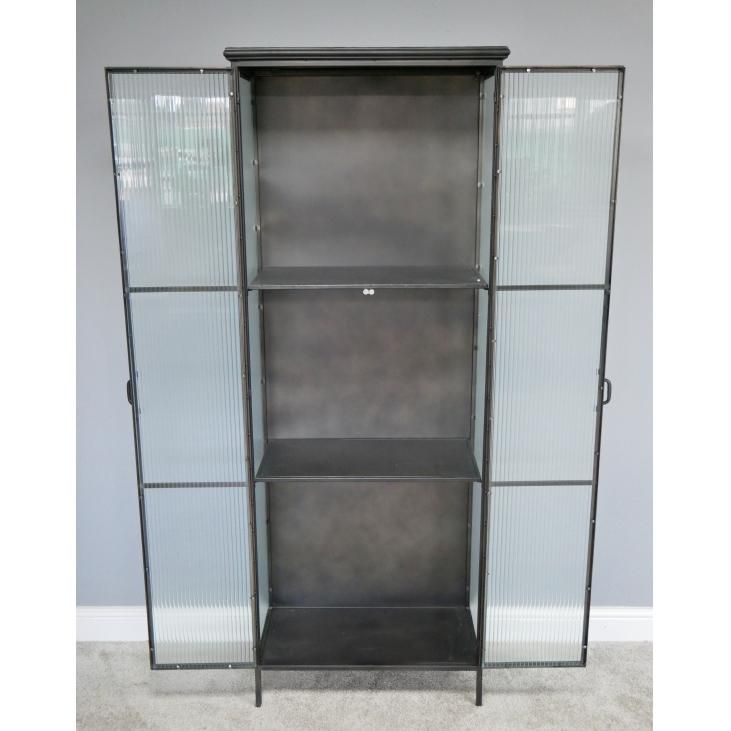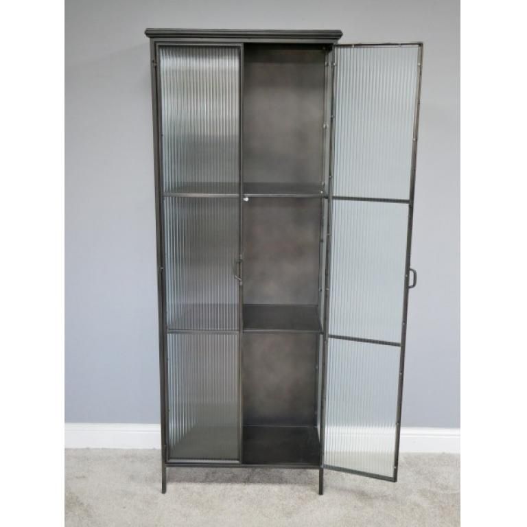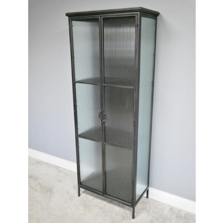 Crafted from high-quality metal, this large cabinet comes with three glass panels across each side except the back, which continues the metal structure. The glass allows for visibility inside the cabinet itself, as well as the metalwork providing durability and sturdiness. The front panel is also a door that opens and closes allowing you to place contents in, or out. The four rounded feet increase the stability during use. This item is perfect for any living area, bedroom, or hallway.