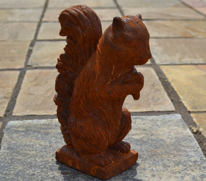 From the flair of his tail to the tip of his nose this squirrel sculpture is simply delightful in detail. Cast in iron the garden sculpture has a rustic finish, lending warmth and authenticity to the piece. A charming example of our native red squirrels this sculpture is an adorable feature for your grounds.