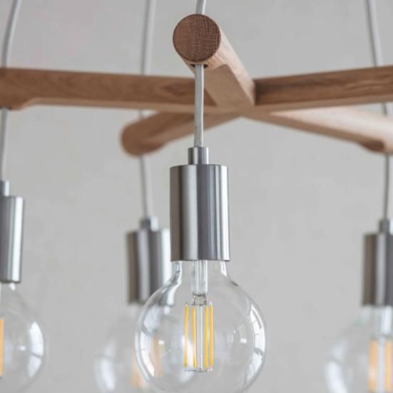 A focal point in any living space, this pendant light contrasts natural oak with sleek satin nickel to create this breath taking and truly unique light. Five vintage bulbs can be added to this light to provide maximum light projection whilst adding a sleek and moderns style to any home. Ideal placement above kitchen islands or above large dining tables to frame the area.