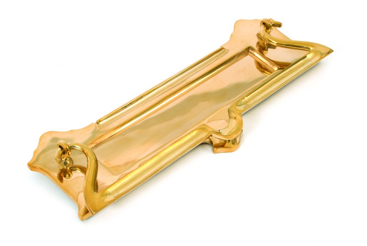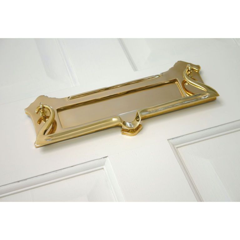This ornate and imposing letter plate is made from solid brass. It features a solid brass door knocker which is secured by curved weighty hooks on either side of the hinged letterplate. A central striker is incorporated into the bottom of the letterplate, to prevent surface damage on the plate or door after extended use. Unlacquered for an authentic polished brass finish, the original patina can be maintained by regular wiping with a lightly oiled cloth. All necessary fixings included. See below for finish details.