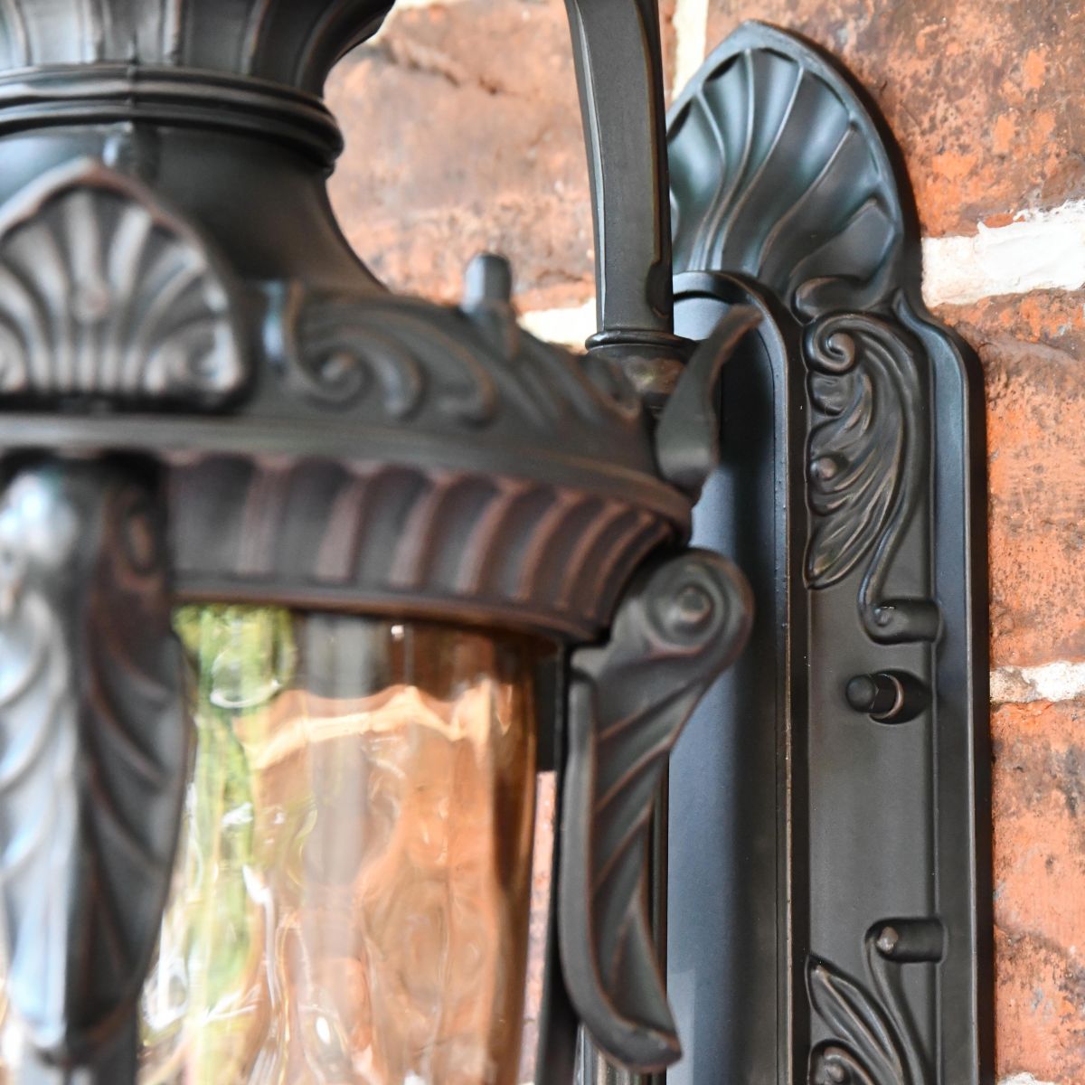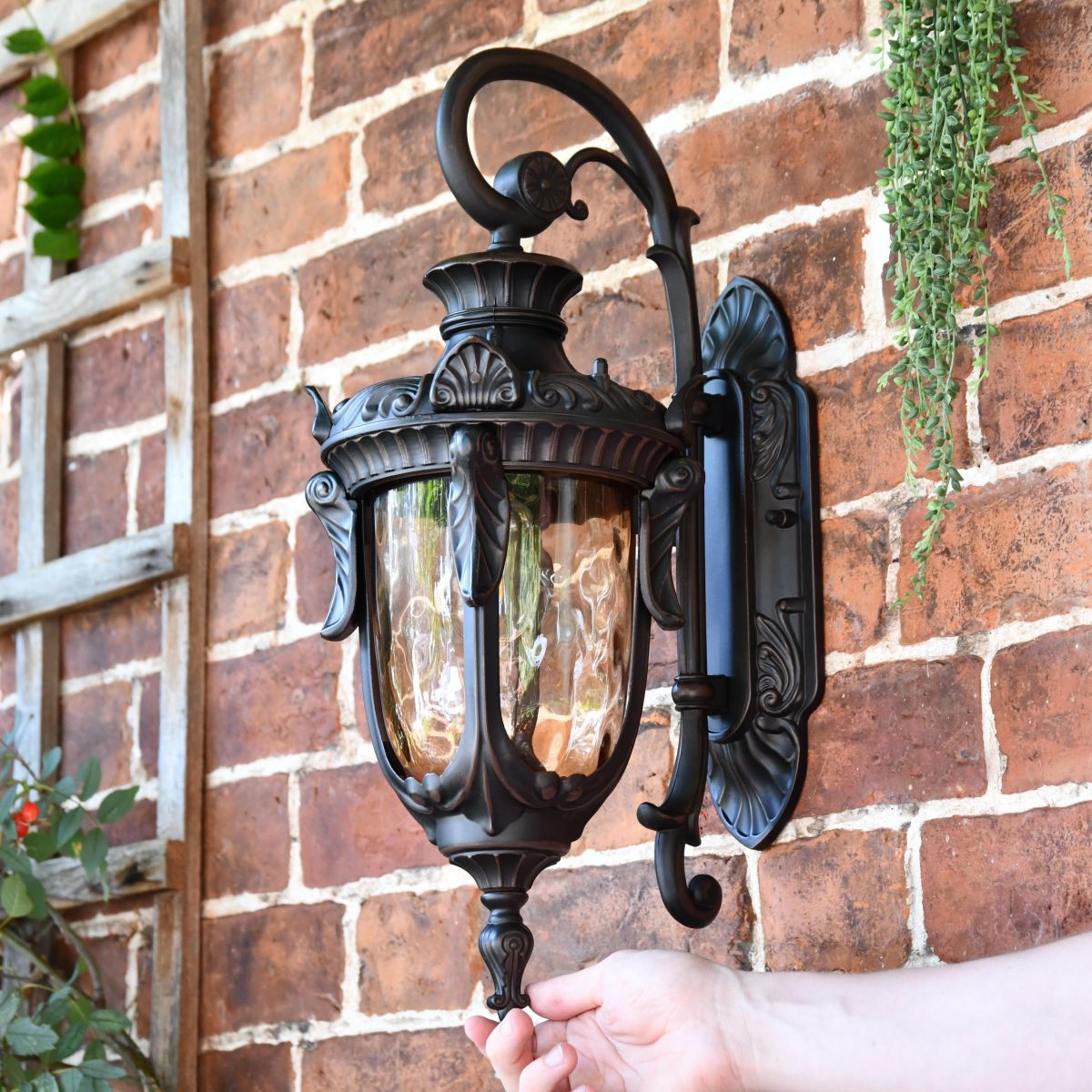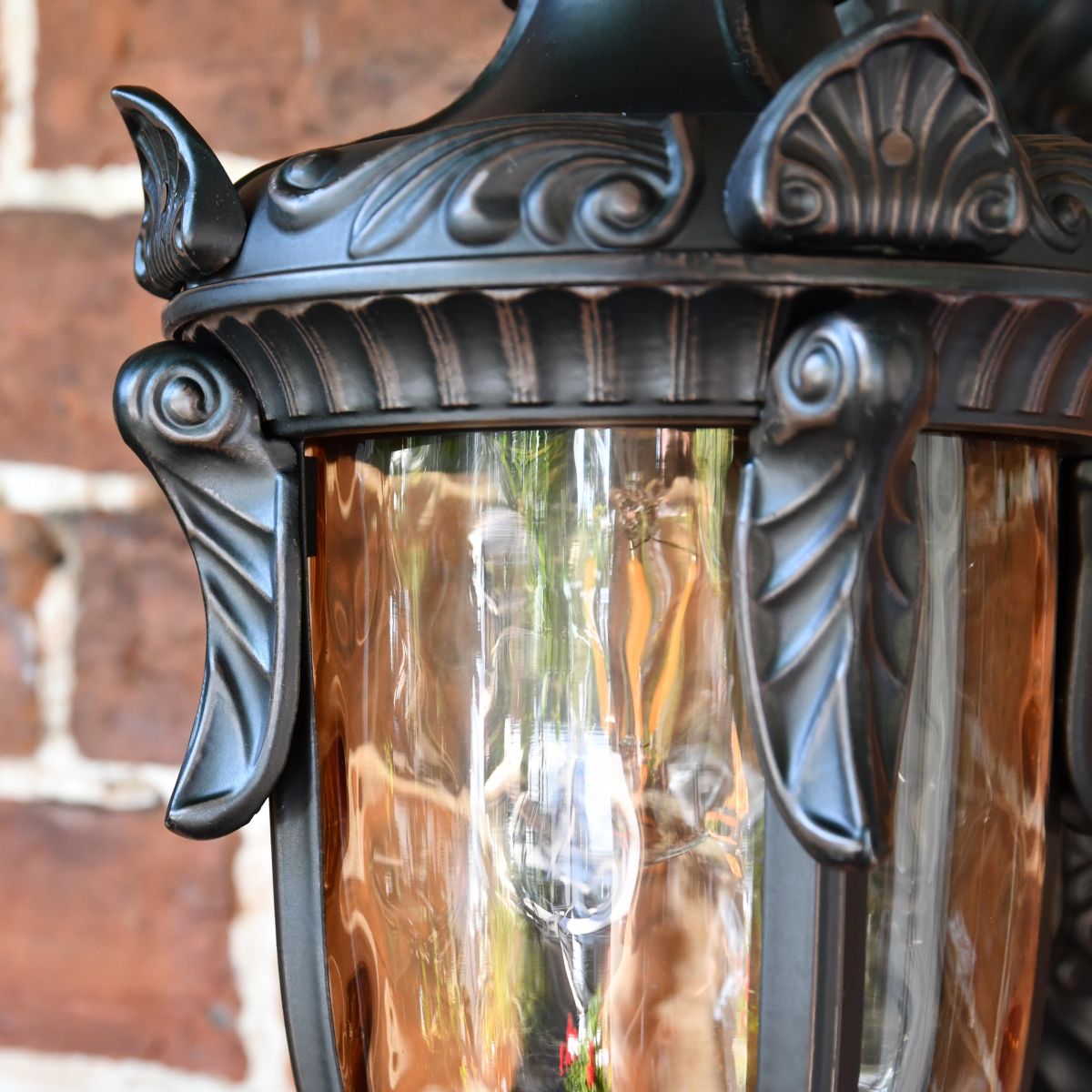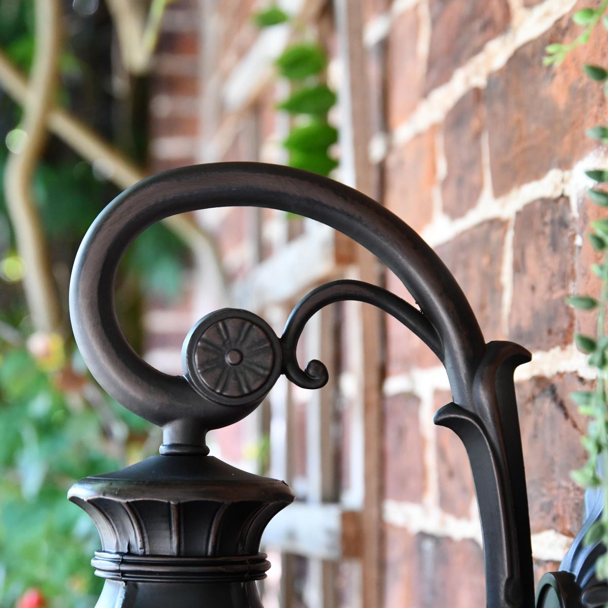 Taking inspiration from traditional art deco design combined with a touch of Gothic architecture, this unique lantern is a wonderful alternative to classic Victorian options. Finished in a rich antique bronze, this lantern would look ideal fitted above an exterior entryway or door. This lantern comes complete with a top-mounted scroll bracket and ornately detailed back plate in a matching finish. Adorned with intricate fleur de lys detailing throughout, this lantern is a truly beautiful testament to quality metalwork design. Fitted with integral panes of tinted glass and a built-in lower bulb holder for maximum outward light projection.