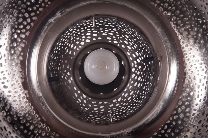 The bulb holder is internal, meaning light spills out through the perforated surface, filling the room with a warm, atmospheric glow.