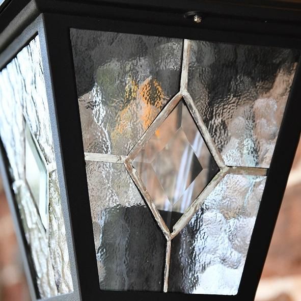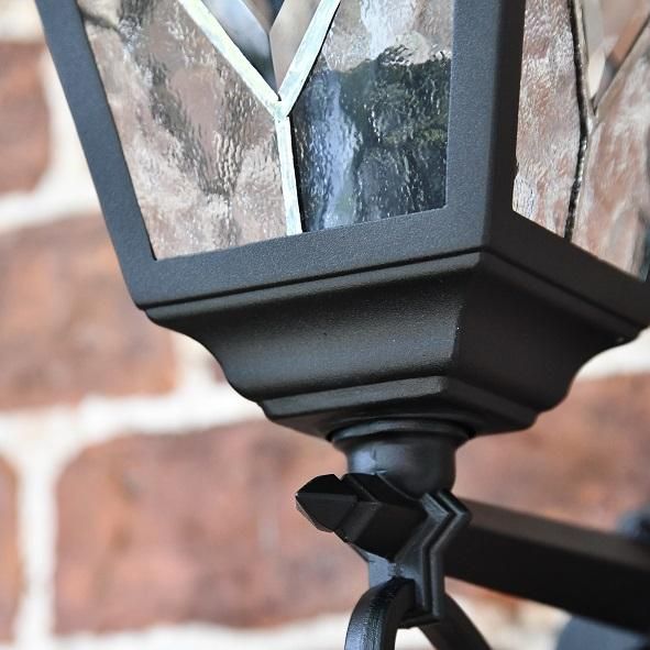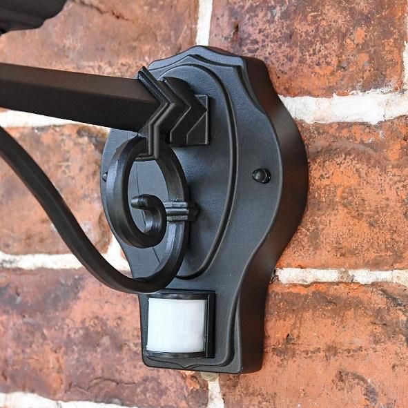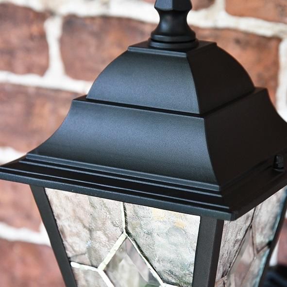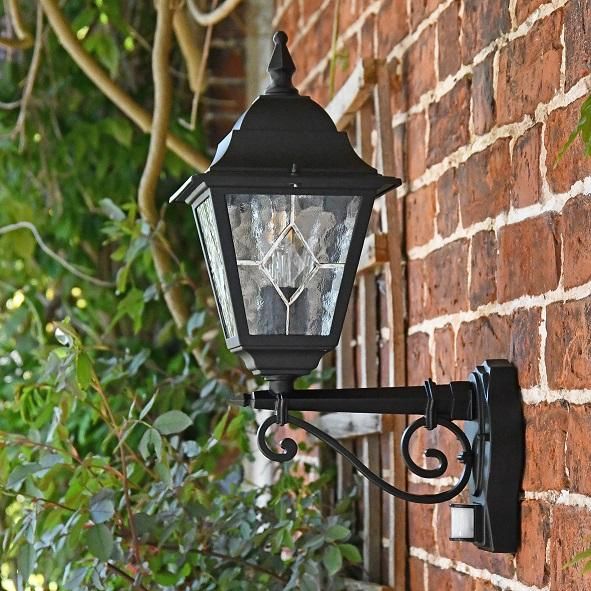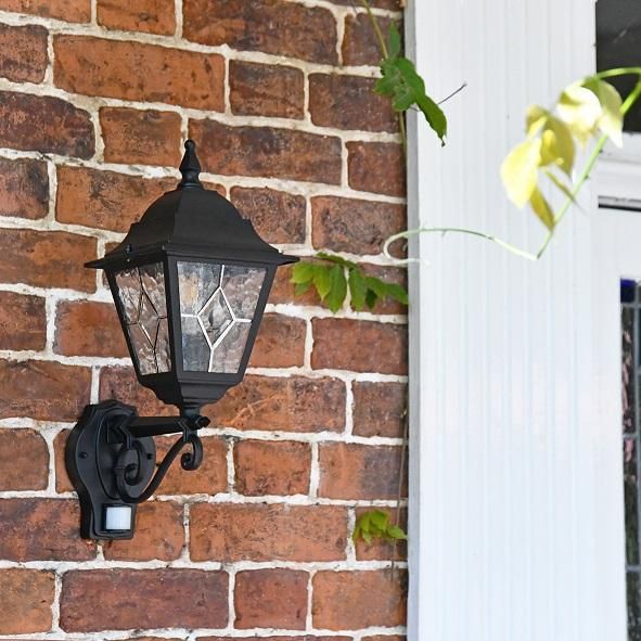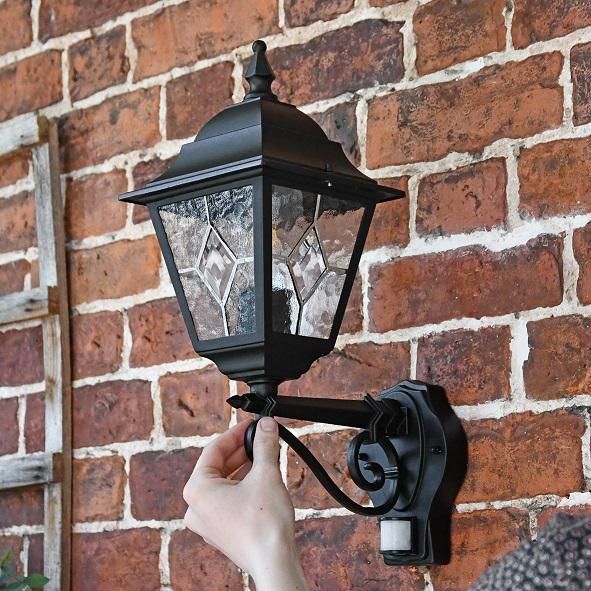 Inspired by a combination of traditional Victorian and country-style design, this beautiful wall lantern design is reminiscent of both period styling and old English gardens. Finished in a sleek midnight black, this design comes complete with a lower-mounted scrolled bracket and back plate in a matching finish. Classically shaped, this lantern comes complete with four integral textured glass panes which have been delicately adorned with diamond leaded detailing, a built-in lower bulb holder, and a PIR sensor. Ideal for fitting beside a door, entryway or on the outer columns of a porch.