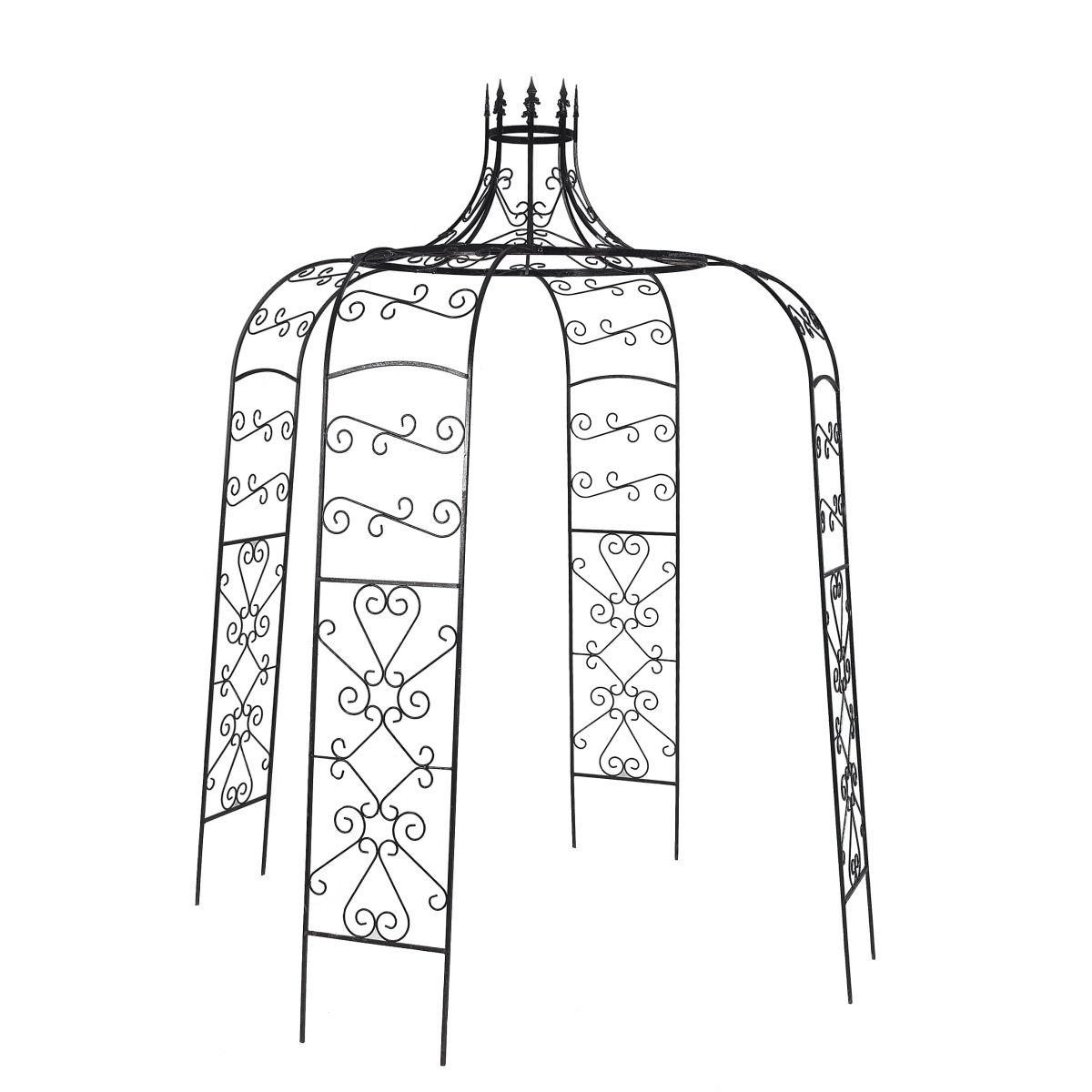 This “Rapunzel” Tower Top Black Gazebo is a unique, four-panel gazebo, hand built in a “tower top” design using high-grade steel and finished in midnight black. Four ornate panels and entrance apertures are perfect for decorating with ivy, trailing vines and interwoven flowers. Constructed from solid wrought iron, no hollow tubes, that has been treated with a mixture of paint and lacquer, this Gazebo is provided with a long-lasting weather resistant finish.