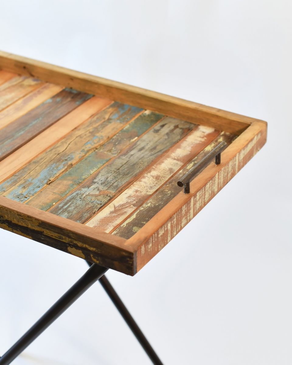Crafted from a combination of reclaimed wood and iron, this side table is easily folded away when not in use to add to its practicality and ease of use. The metal legs come together to create a solid structure for the wooden top, complete with a beautiful rustic finish. Perfect to add to your living space, dining room, hallway, or even bedroom.