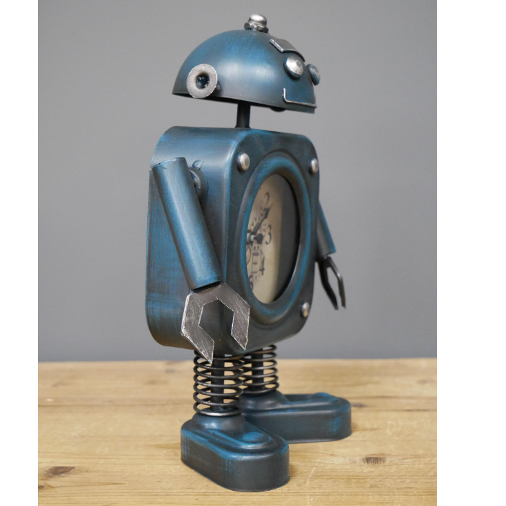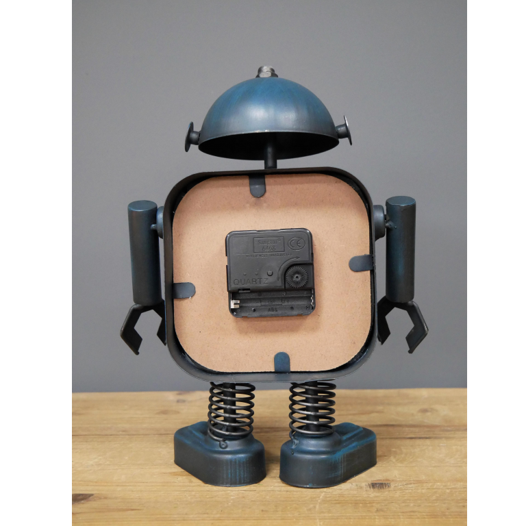 Crafted from high quality steel and finished in a beautiful deep sea blue finish, this fun and quirky clock is ideal for desks, bedrooms and living spaces. Created with the future in mind, this clock depicts a happy robot crafted from recycled metal parts and materials including springs and spanner heads. His stomach features a large circular clock face which includes a cog design within, numerals and two hands for easy time reading. Free standing, this robot clock encompasses a battery pack in its back for easy battery changing.