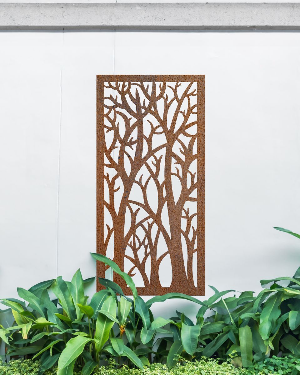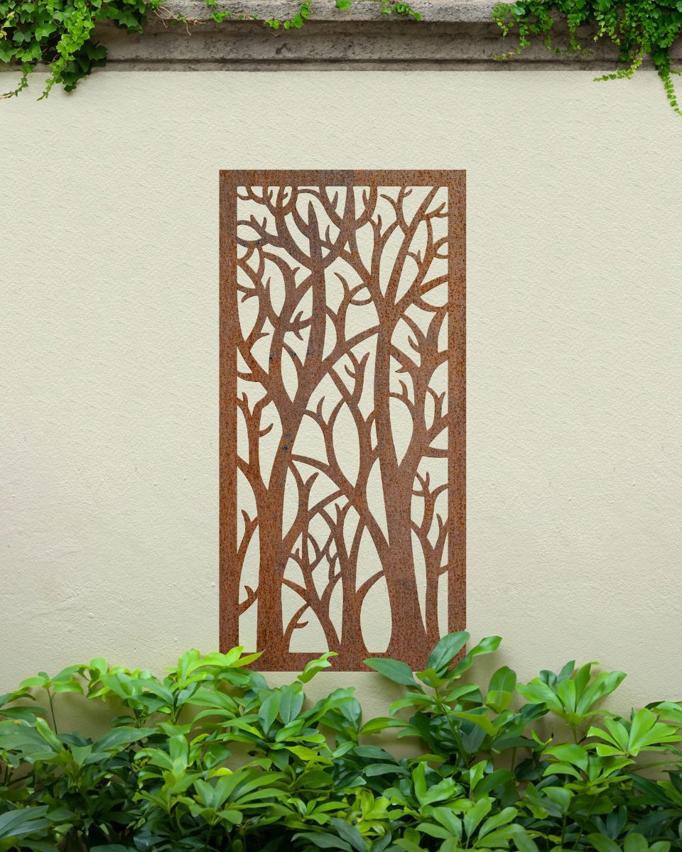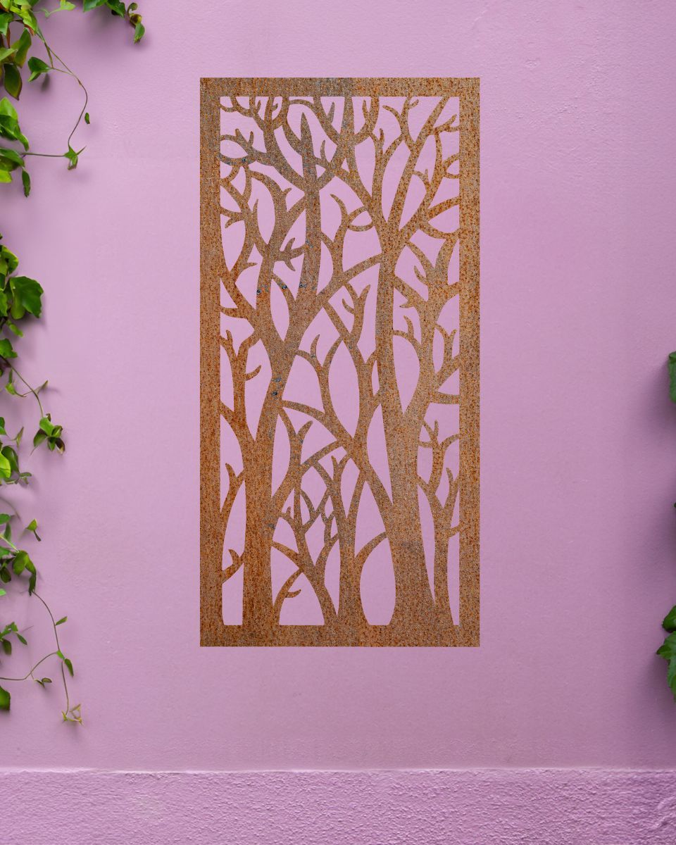 Turn your garden wall into an art piece by adding this rustic autumnal trees garden wall art. Carefully crafted from thick robust steel by our in-house team and finished in an aged rust effect. This rustic garden wall art features the beautiful silhouette of autumnal trees, intricately capturing the details of each branch. asily mounted onto any garden wall to create a talking point for your guests.