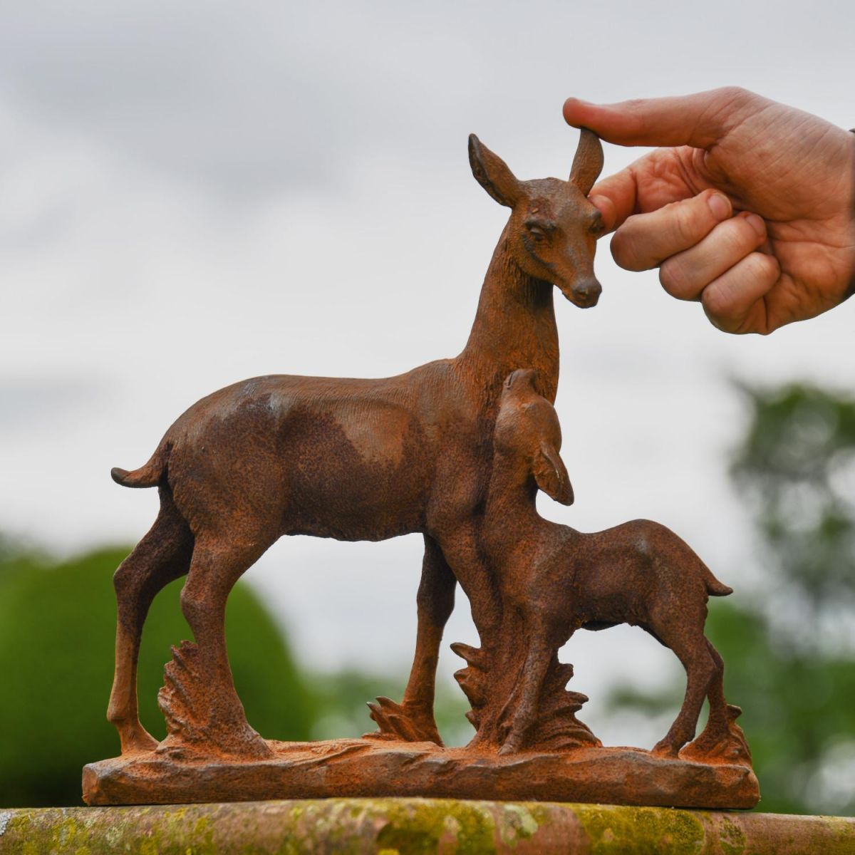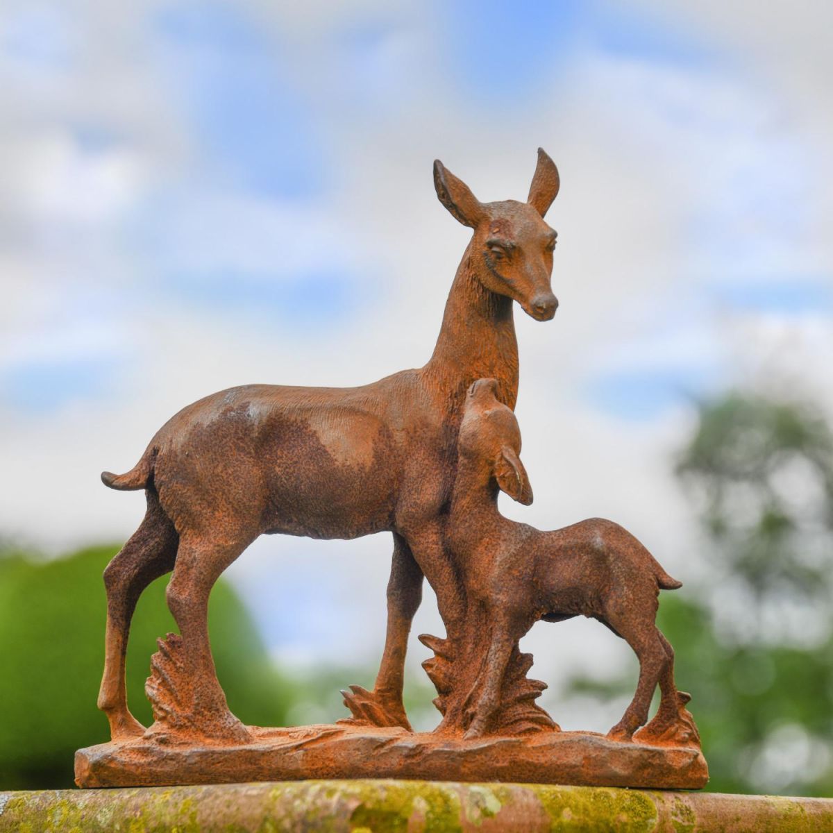 Expertly designed and crafted using cast iron and left to produce a naturally aging rustic finish, this garden sculpture exhibits a mother deer accompanying her calf in amongst nature. Stunning in detail, this sculpture carefully emits the bond between mother and child, through stunning facial expressions and positioning of the two animals. This item comes fixed to a base, providing increased support as well as allowing the sculpture to be freestanding. The perfect addition for any garden space befitting of an animal and nature lover!