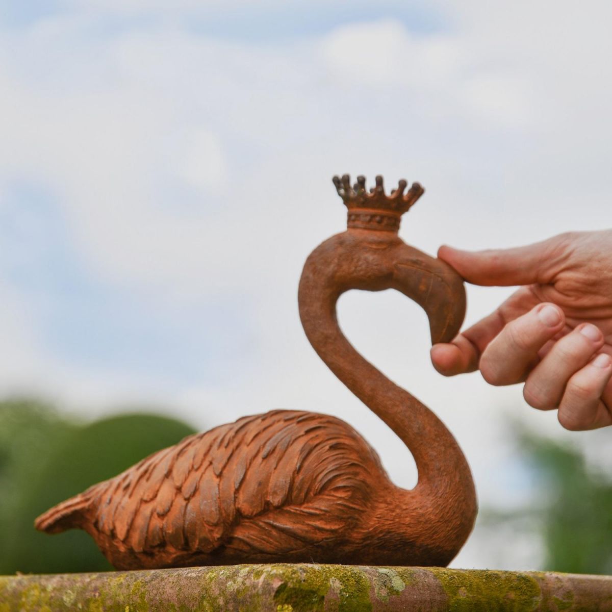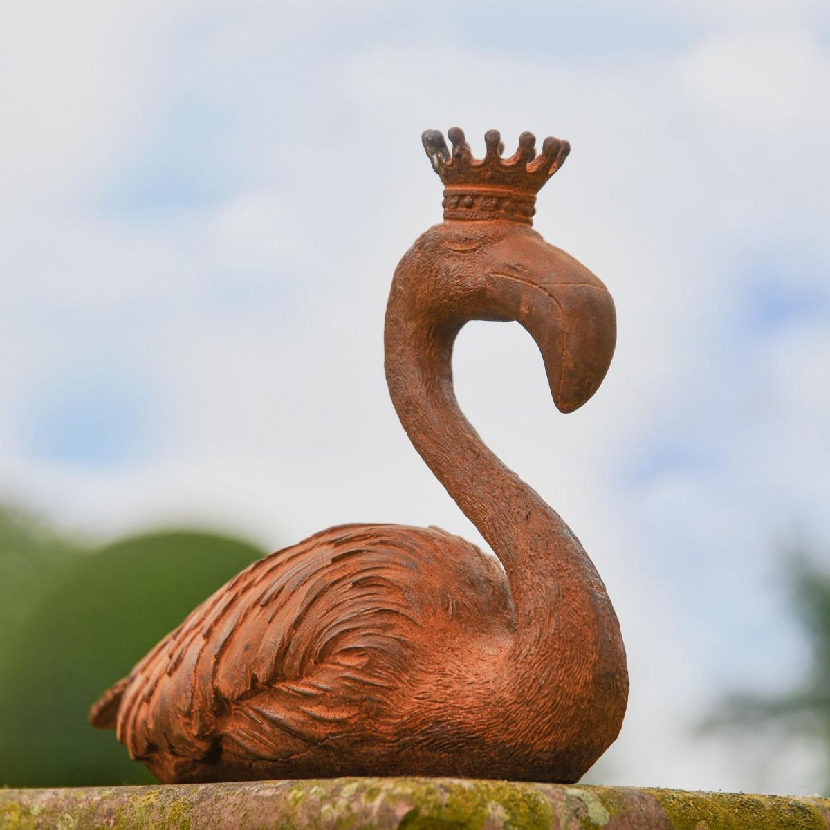 Crafted from high quality robust cast iron and left to naturally age when exposed to the elements, this sculpture is a fun and quirky addition to any garden. Depicting a sitting flamingo with crown on his head, this sculpture symbolises beauty, balance and pizazz, which is certainly what this sculpture will bring to your garden setting. Despite this garden sculpture having been created from a casting, it is highly detailed throughout including the beading and embellishments along the trim of the crown and the feathering in the body of the sculpture.
