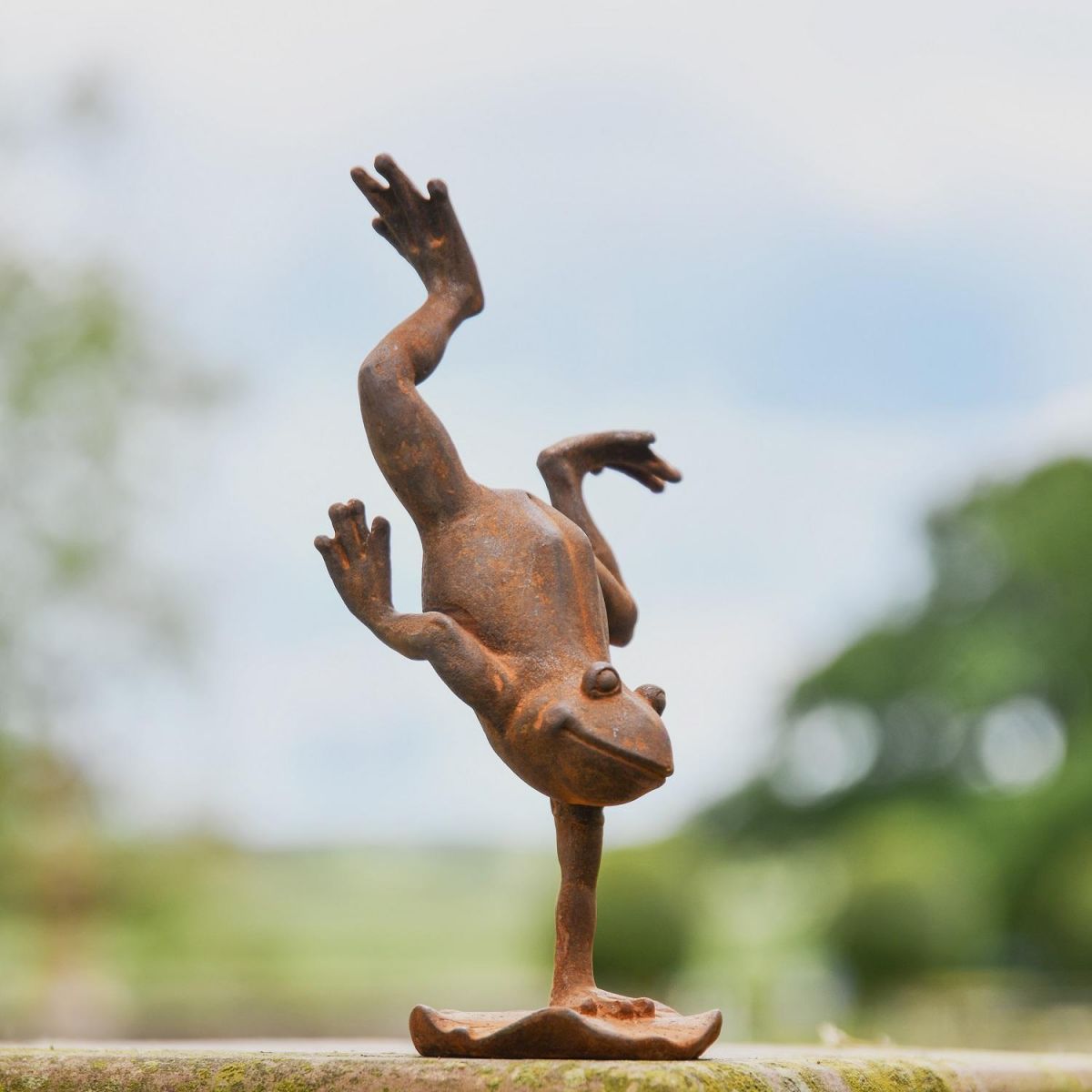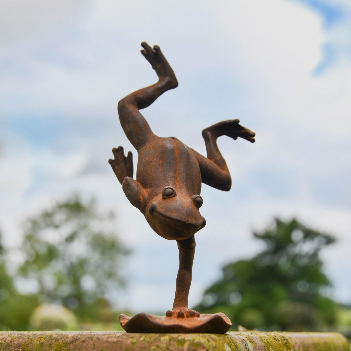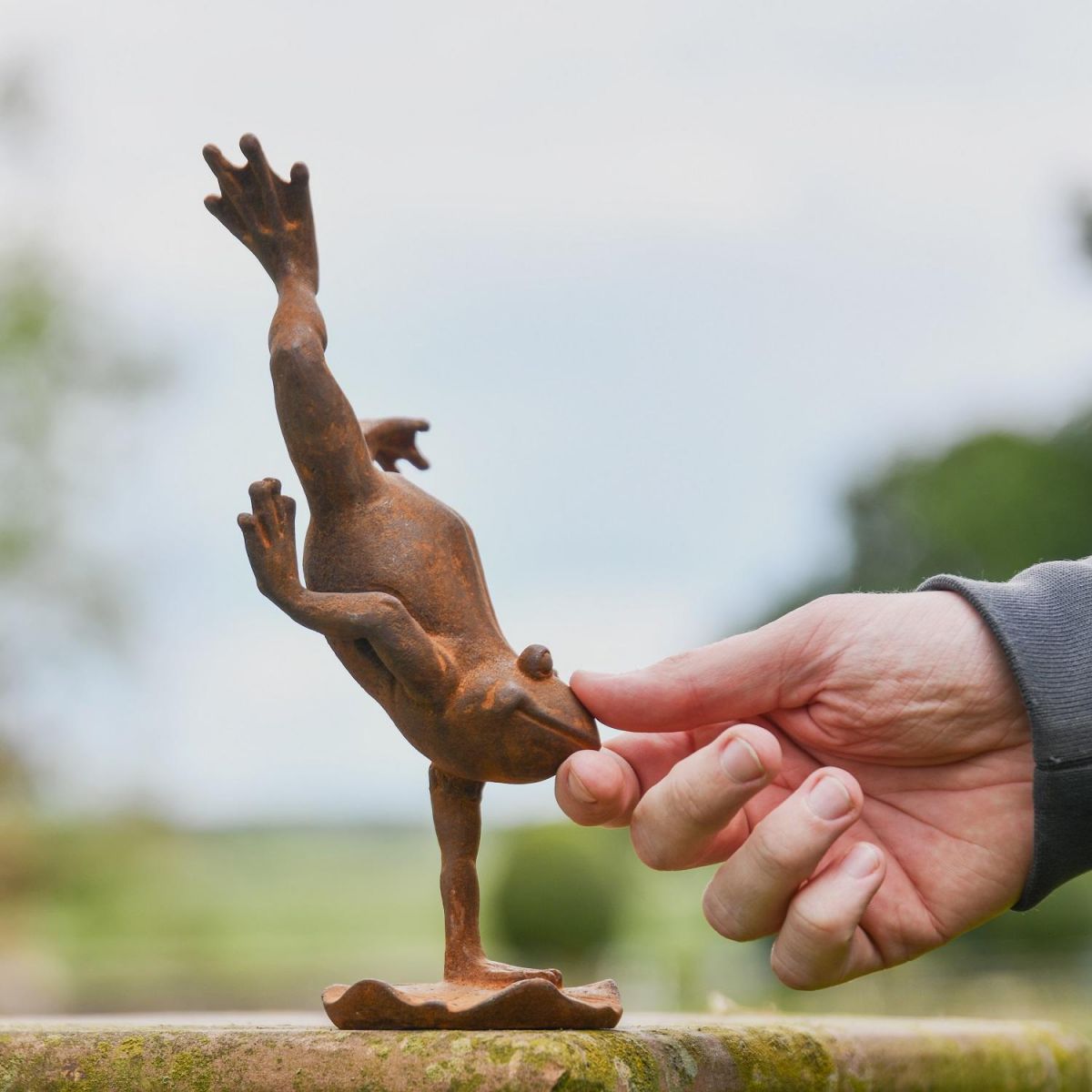 Add a little character and cheer to your garden with this fun and quirky frog sculpture. Created from high quality cast iron which as been moulded, this garden sculpture has been aged to form a beautiful rustic finish. Balancing on a lily pad on one hand, as if doing a handstand, he has a sweet grin upon his face. Free standing, place this garden sculpture as a statement piece on plinths or on columns, or within flowerbeds to create charm.