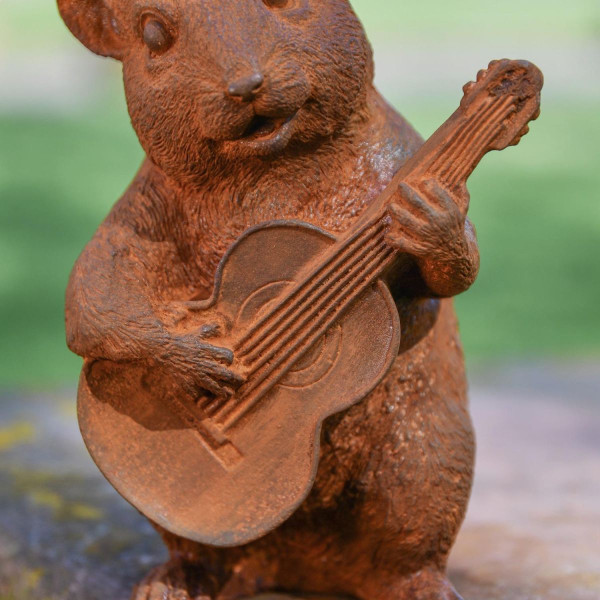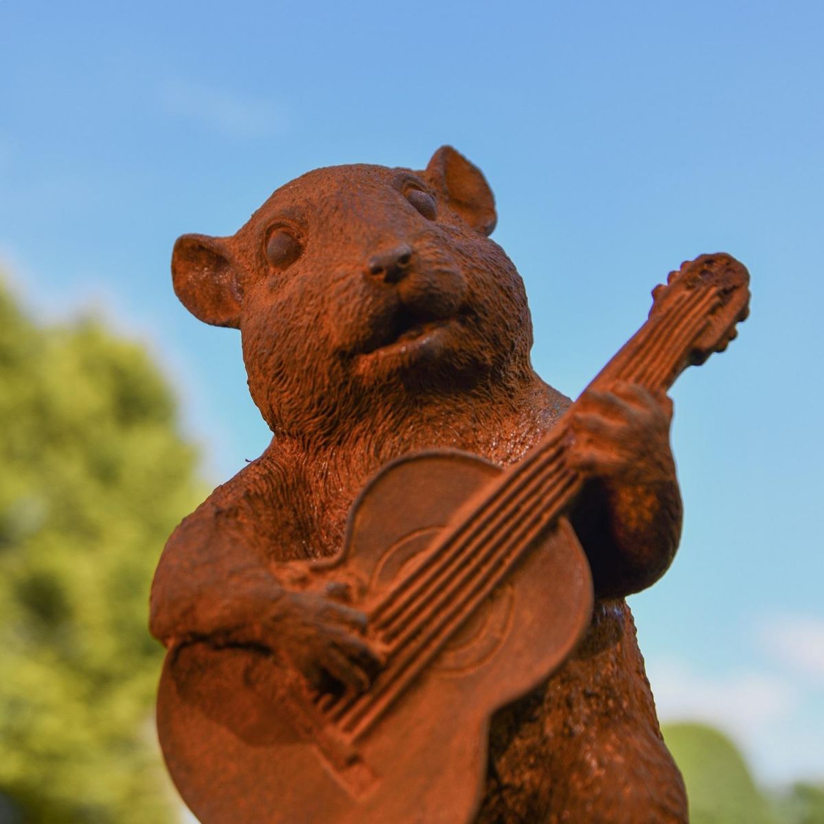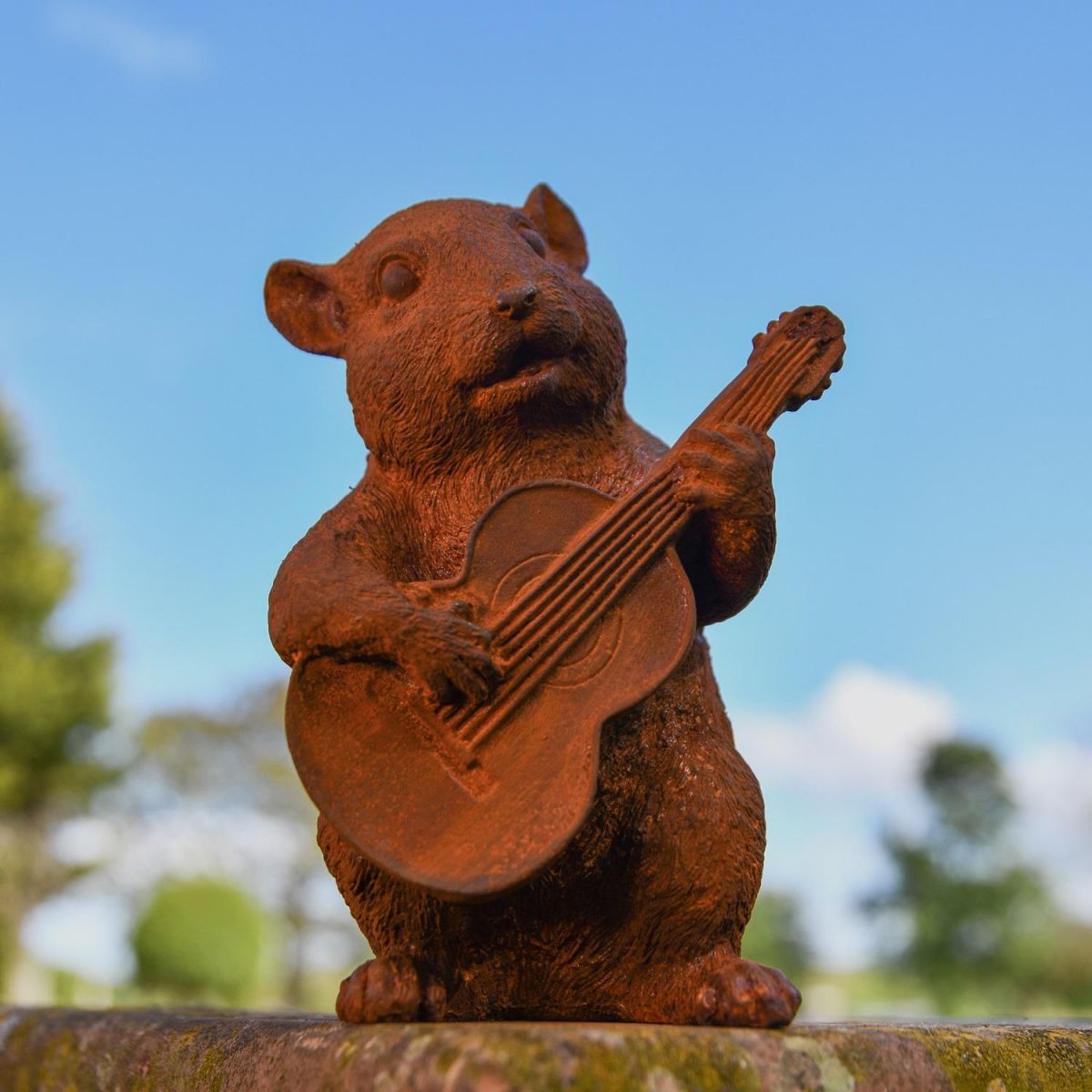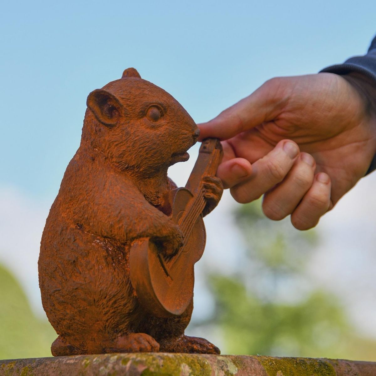 Created from high quality robust iron and left to naturally age when exposed to the elements, this fun and quirky garden sculpture depicts a common animal in the North American woodland, the Chipmunk. Musically talented, this chipmunk can be seen playing the guitar, adding character and charm to any garden setting. Highly detailed throughout, the texture across the chipmunks fur can be seen visibly, as can the strings on the guitar. Keep as a single item or pair with others in the musical collection.