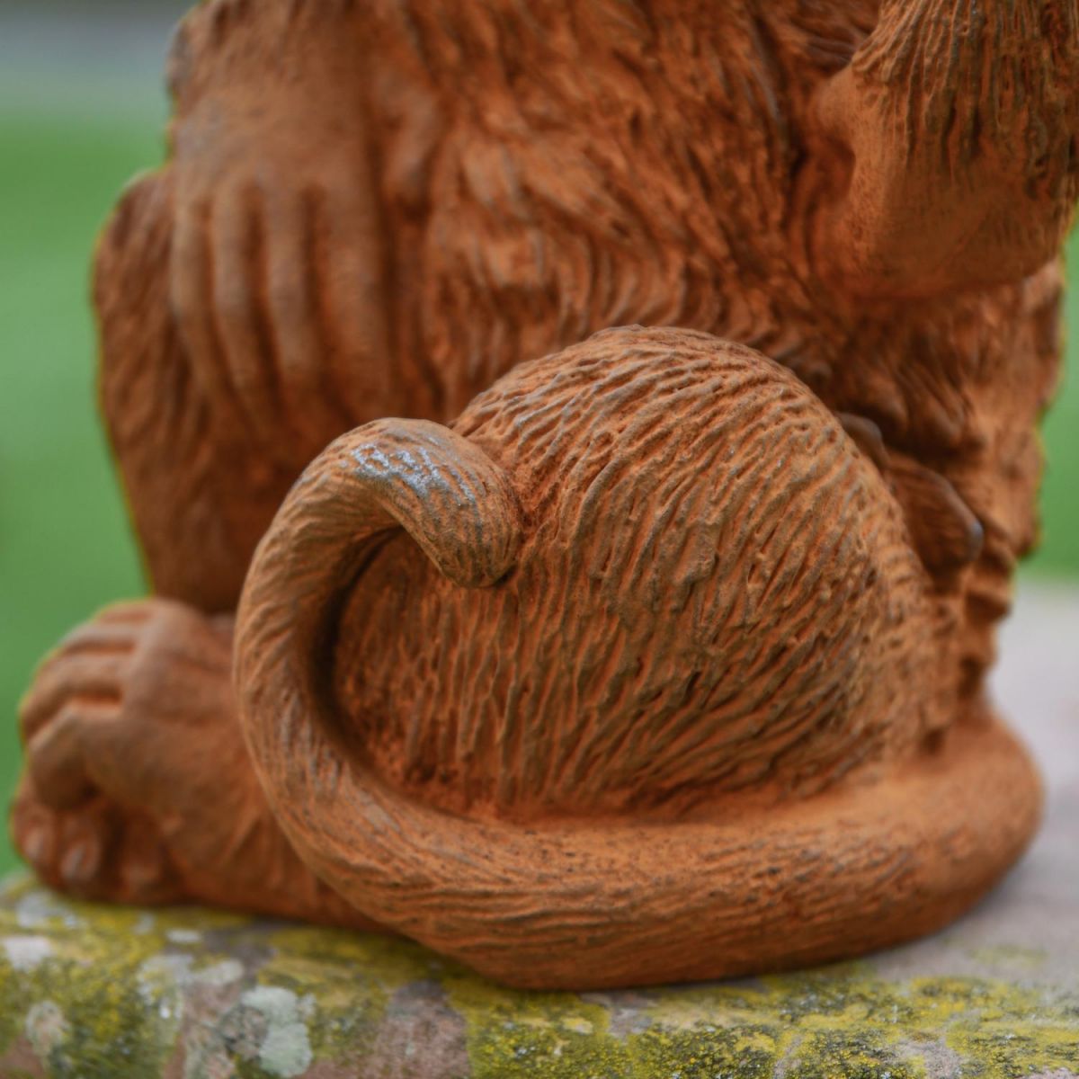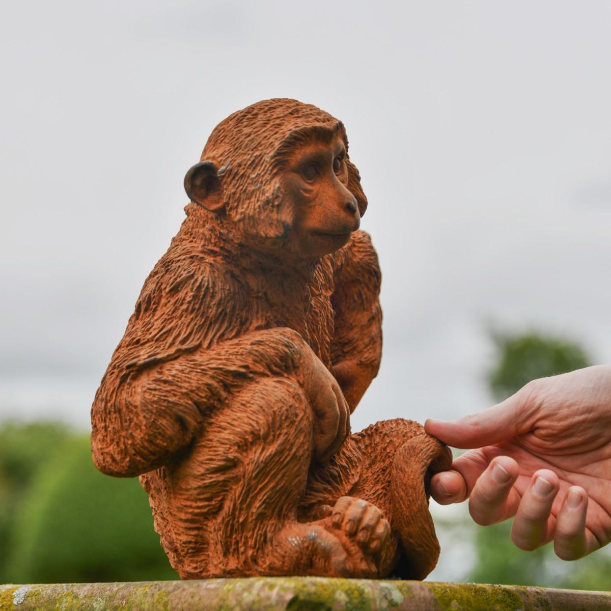 Made and crafted using cast iron and left to produce a naturally aging rustic finish, this garden sculpture showcases a monkey, sitting whilst scratching its side. Expertly detailed, ranging from the facial features down to each individual hair molecule. This garden statue comes with a flat base allowing it to be placed to your leisure, standing independently. The perfect addition for anyone in the need of adding a degree of character to their garden space!
