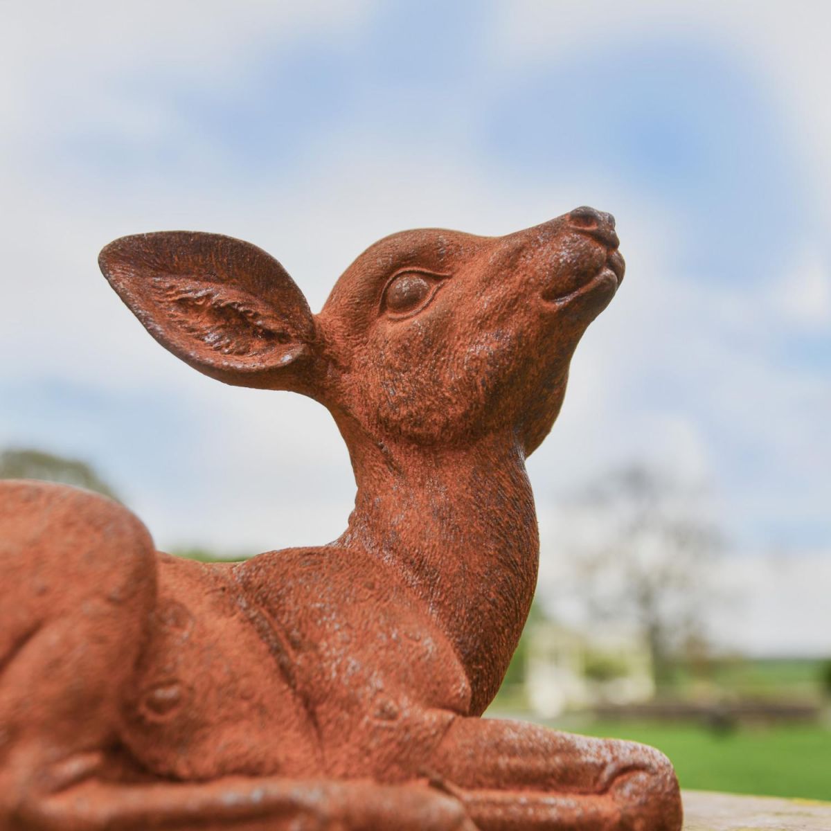 Expertly crafted using cast iron and left to produce a naturally aging rustic finish, this garden sculpture showcases a sitting doe, innocently looking up into the summer’s sky. Stunning in detail, this sculpture carefully embodies the purity and beauty of the animal. This item comes with a flat base designed to allow for the sculpture to sit flush along the floor or desired placement. The perfect addition for any garden space befitting of an animal and nature lover!