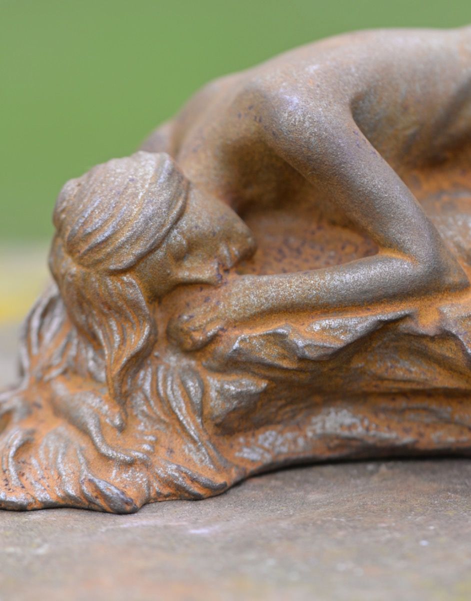 A lovely way to add an instant touch of serenity to your garden setting, this stunning sculpture depicts a sleeping woman as she takes a nap on a rock. Carefully crafted from cast iron, this statue has been left to age naturally which beautifully highlights each intricate detail. From her long flowing hair to her relaxed facial expression, this garden sculpture looks as if it was taken directly from an art museum. Perfect for placement in amongst foliage and flowers or beside a pond.