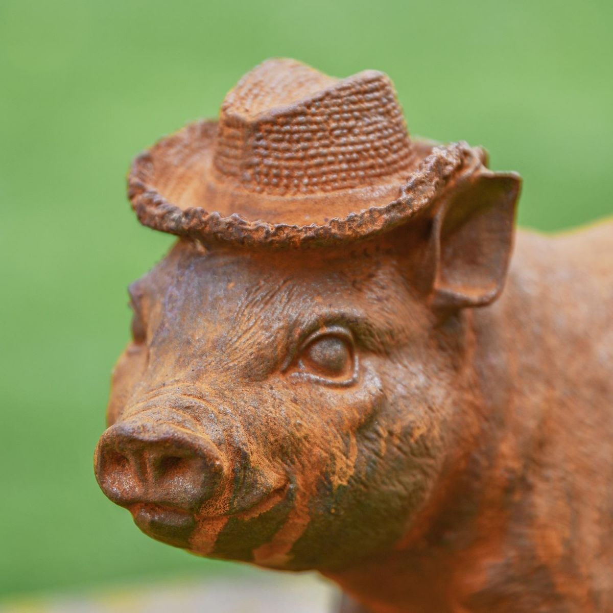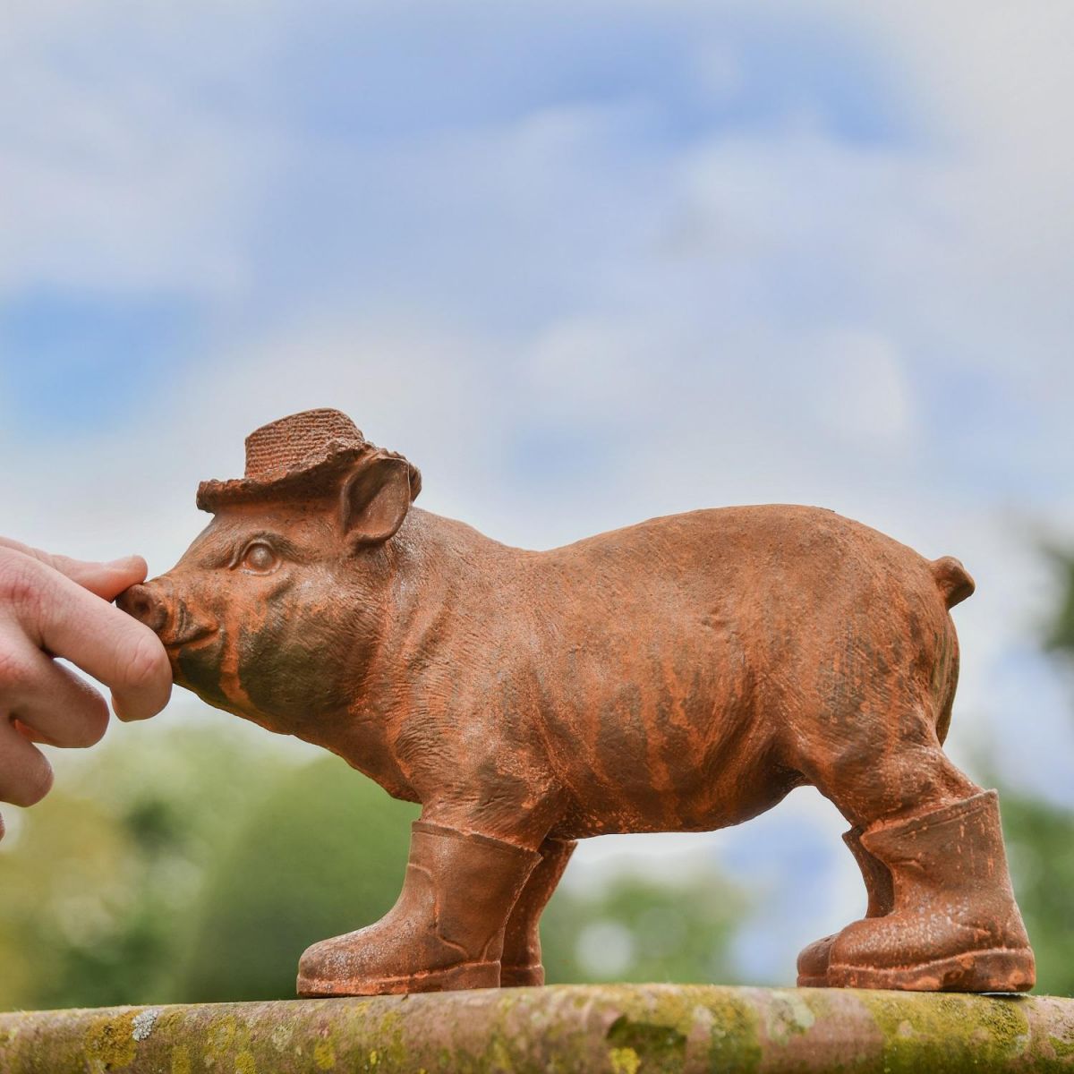 Designed to be placed in the garden, patio and within flowerbeds, this fun and quirky farmyard garden sculpture is a must have for anyone who loves pigs or alternative pieces in the garden. Created from a casting using robust iron, this sculpture is highly detailed adding to the overall character and charm. With detailing across the straw hat, the texture across the pig’s body and the welly boots, this sculpture is perfect for placement outdoors all year round and would best be suited for farms and anyone who loves pigs.