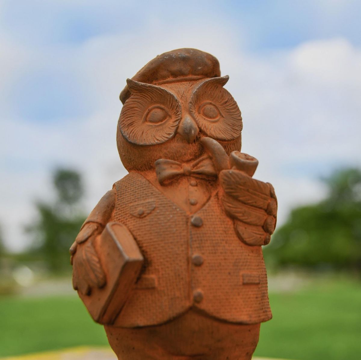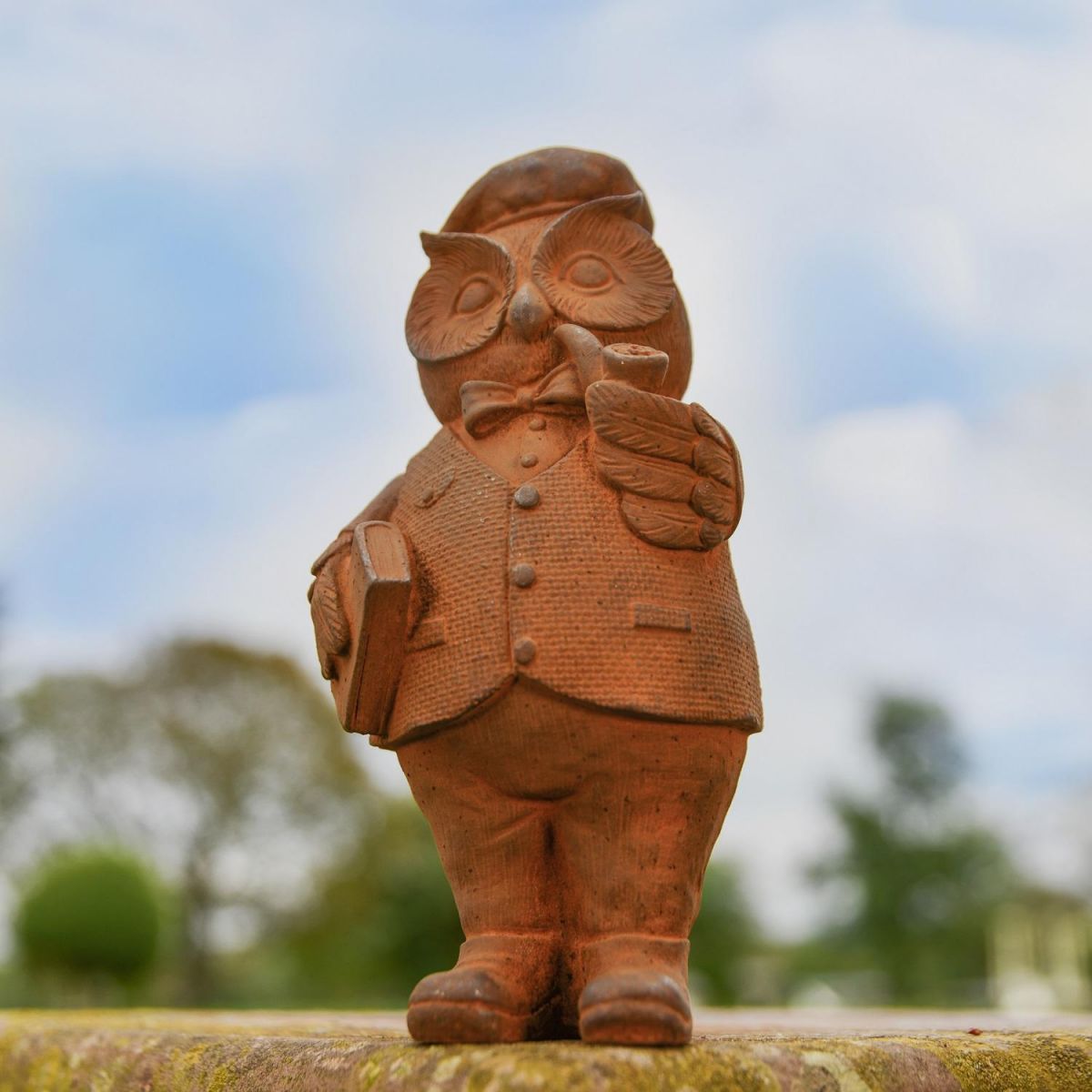Created from high quality iron and left to naturally age when exposed to the elements, this fantastic sculpture depicts a studious owl with book and pipe in hand. Despite being small in stature, this sculpture is extremely detailed, whereby every feather detailing can be seen as can the texture on his waistcoat and buttoning. A wonderful addition to any garden setting. Keep as a single item or pair with others in the owl collection and create your own sophisticated garden area.