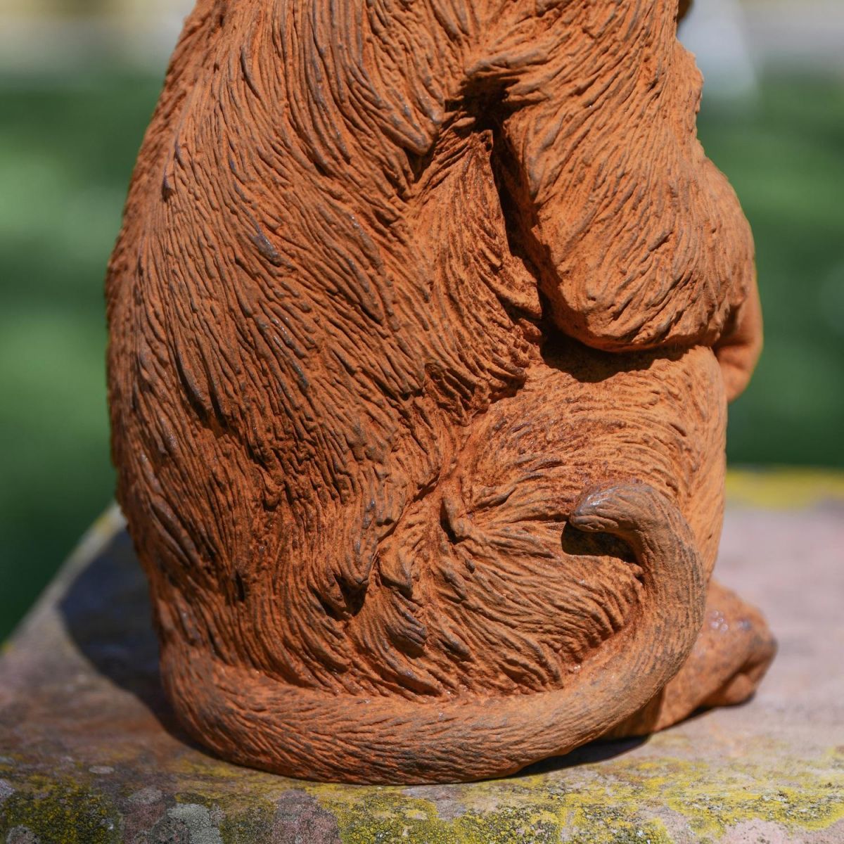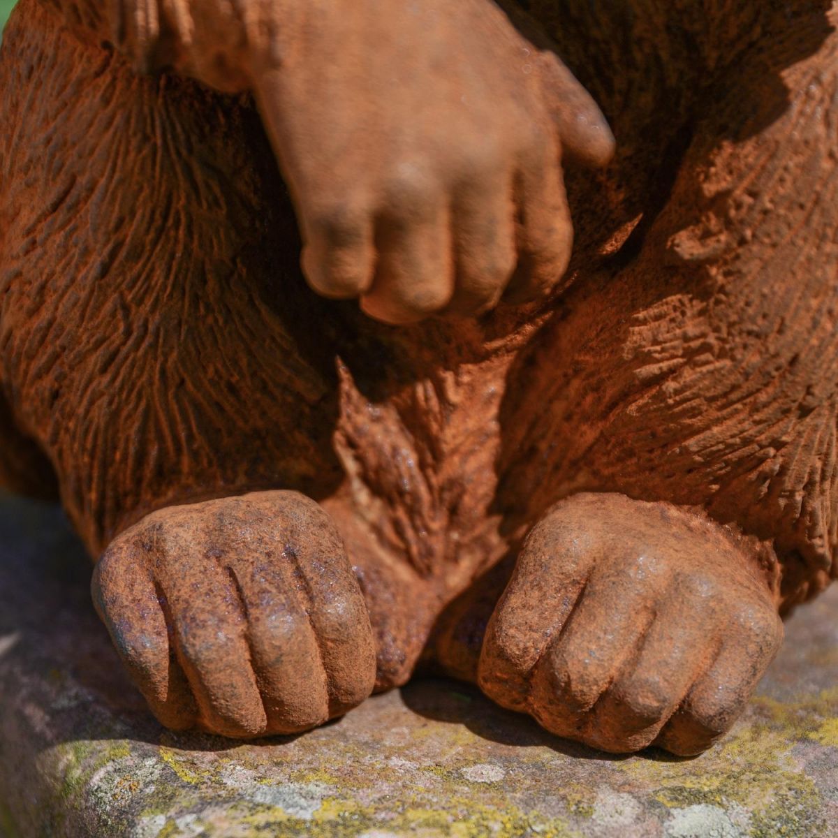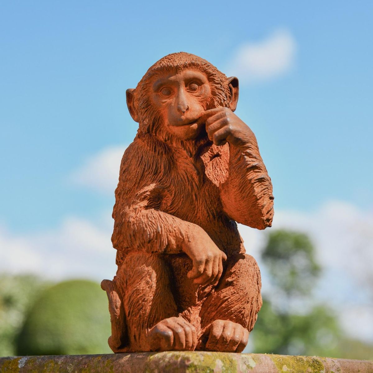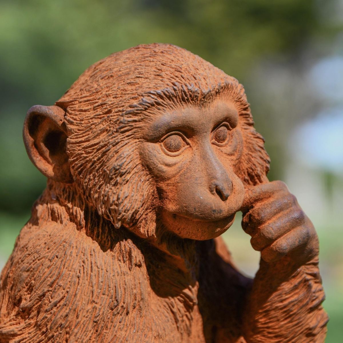 Designed and crafted using high quality robust cast iron and left to naturally age when exposed to the elements, this garden sculpture depicts a sitting monkey, with finger in its mouth, as if thinking hard. Despite being created from a mould, this sculpture is expertly detailed, including texture around the fur detailing, the fingers and toes and also the facial expression. A wonderful and characterful sculpture for the garden, patio or flowerbed.