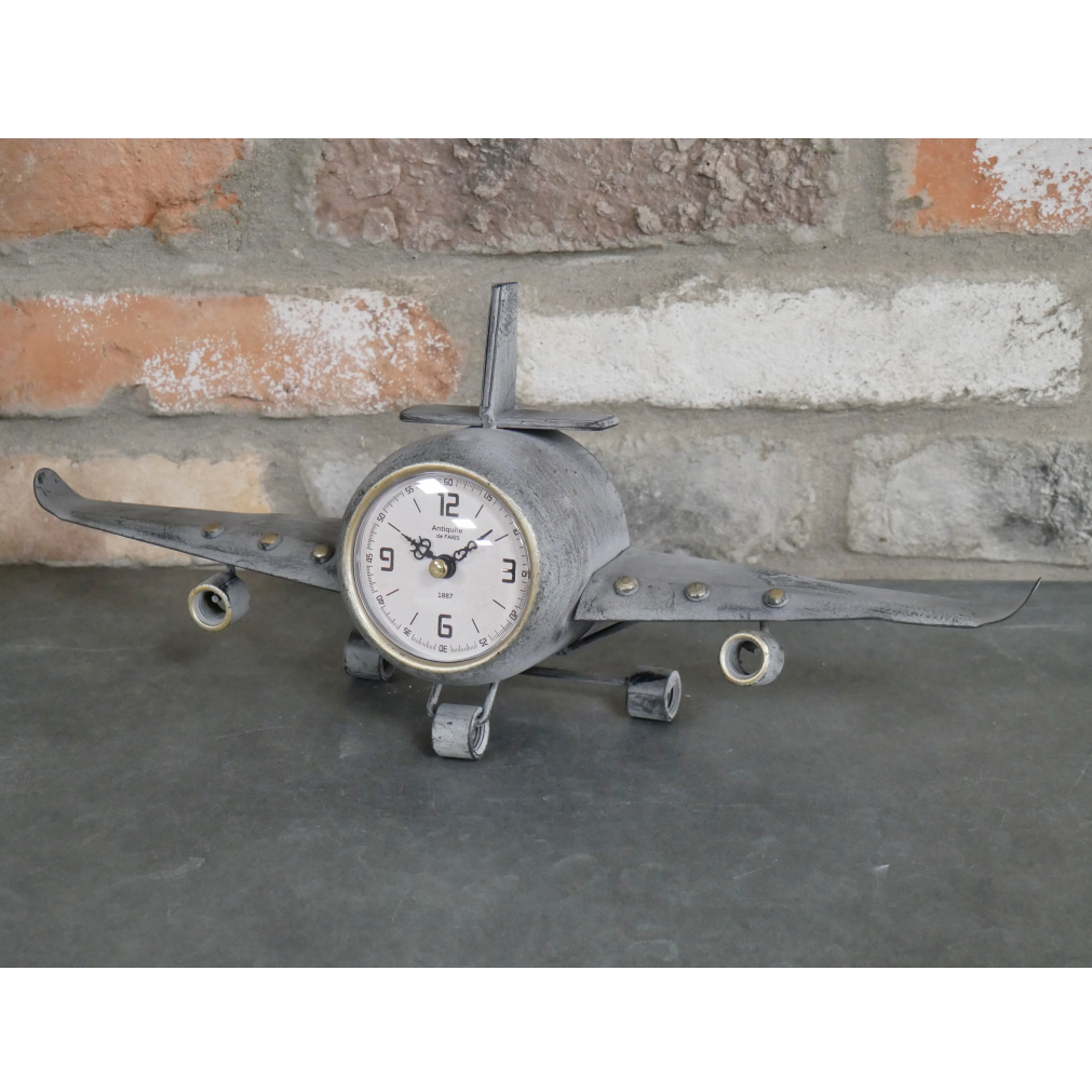 This fun and unique wall mountable or free-standing clock is ideal for aviation enthusiasts. With a rustic grey finish, the aeroplane has wing. body, engine and feet type detailing. The clocks face comprises of all the necessary clock faces including seconds. With the words 'ANTIQUE DE PARIS, 1887' in the centre of the face, it provides an antiqueness to this clock. A beautiful piece for any interior room.