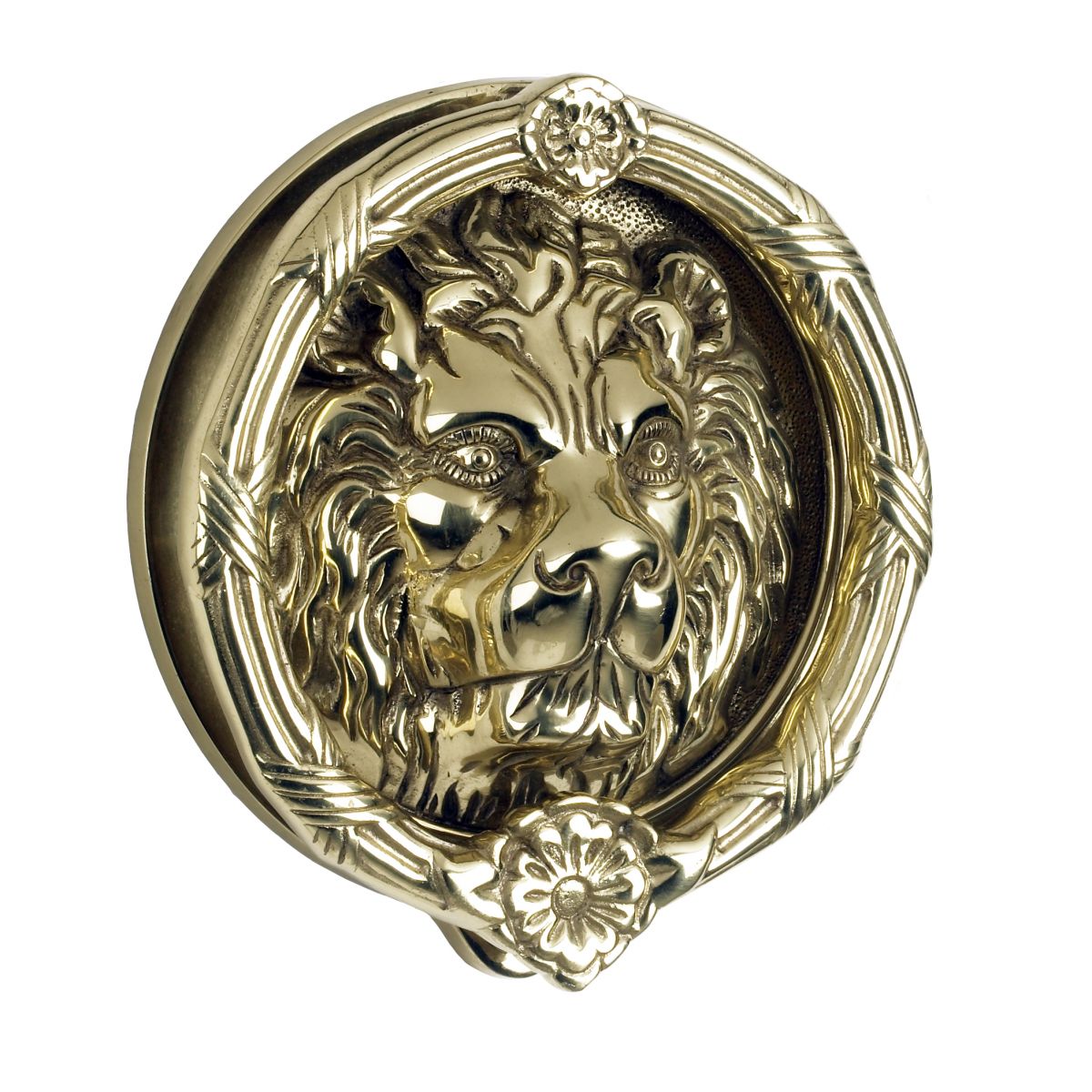 This magnificent door knocker features a large lion, sculpted onto a beautiful heavy circular backplate. The stunning ornate frame that fits around the lions face is also the integral beater. This fascinating and greatly detailed door knocker was originally created for the large grand, establishment, but will look at home anywhere, where a magnificent first impression is required. This large door knocker is finished in a polished brass.