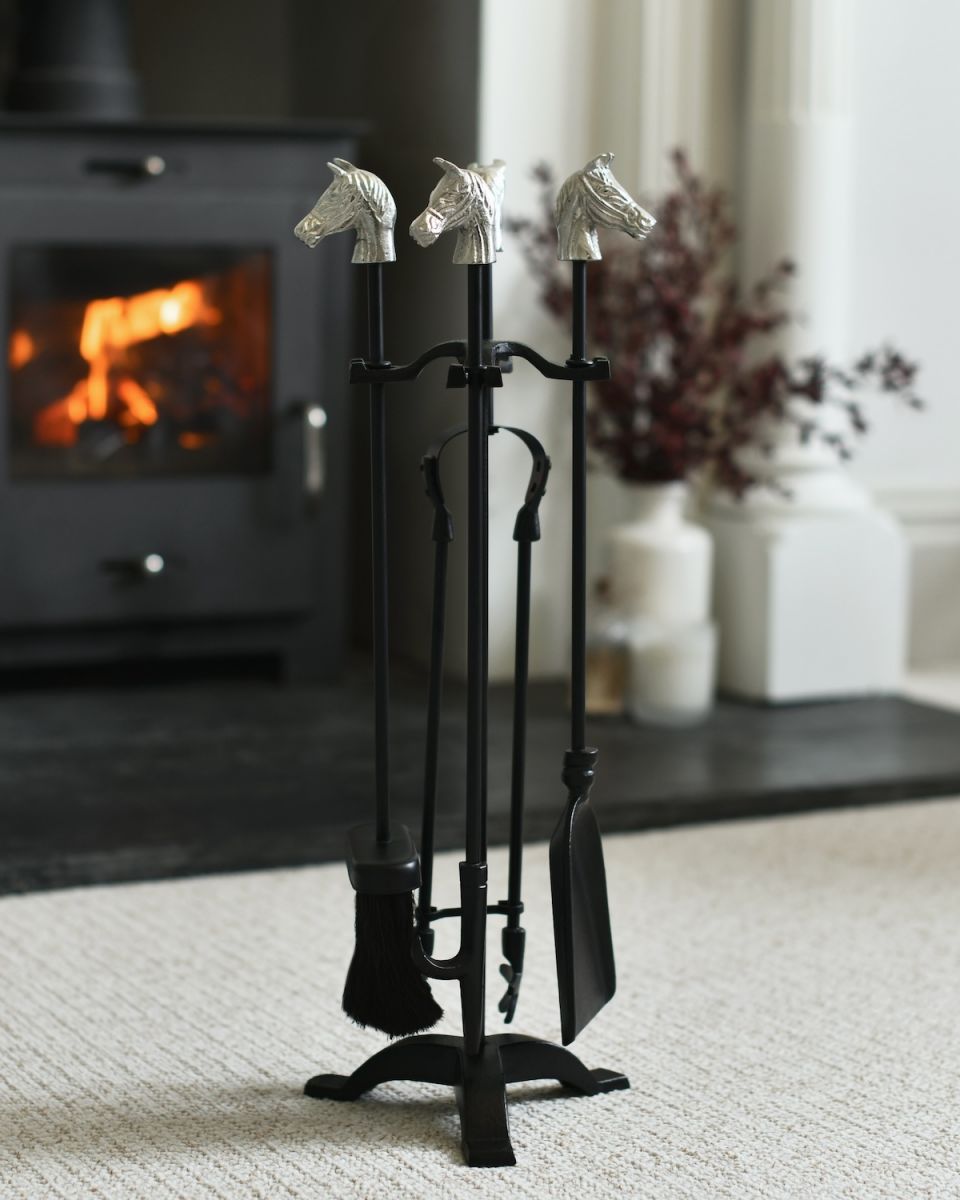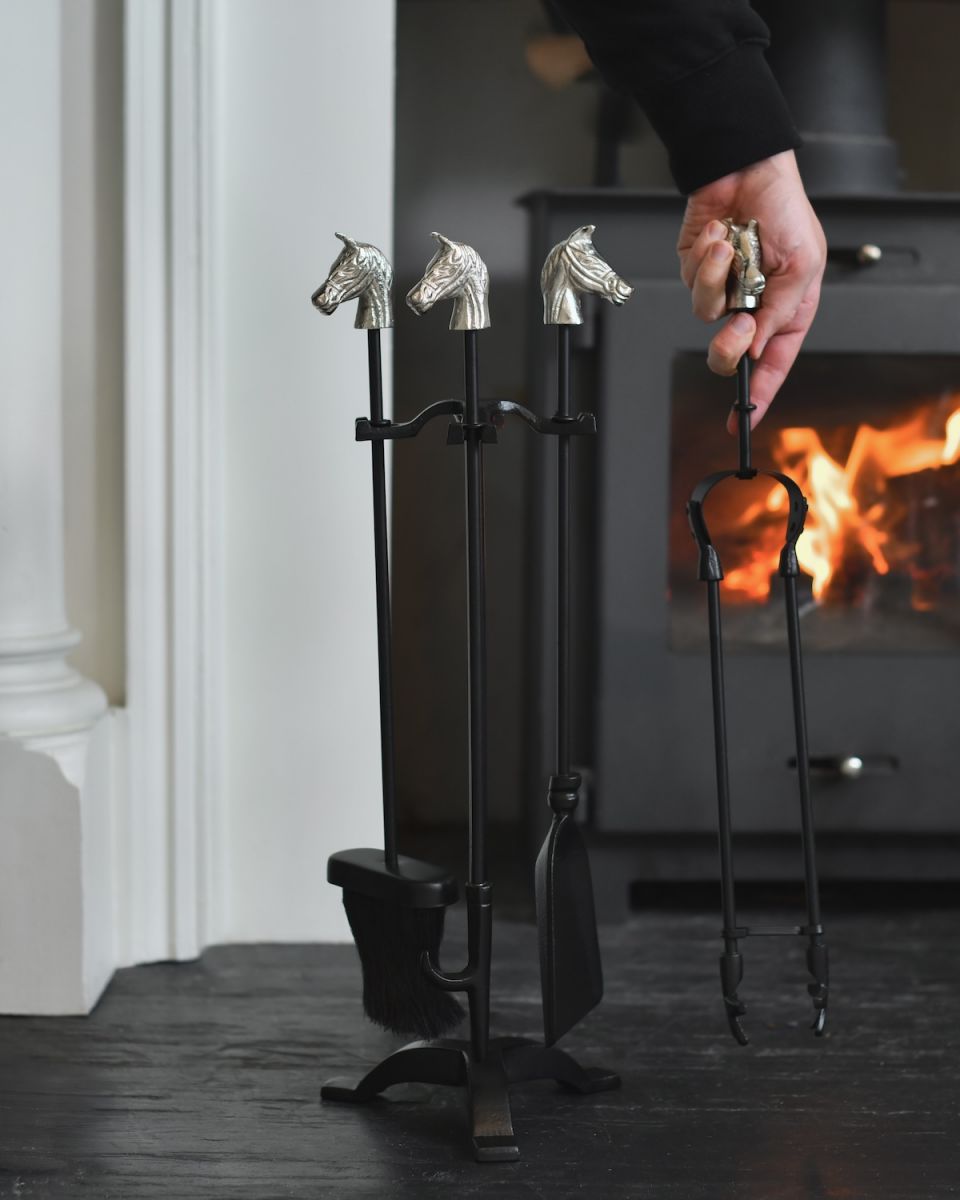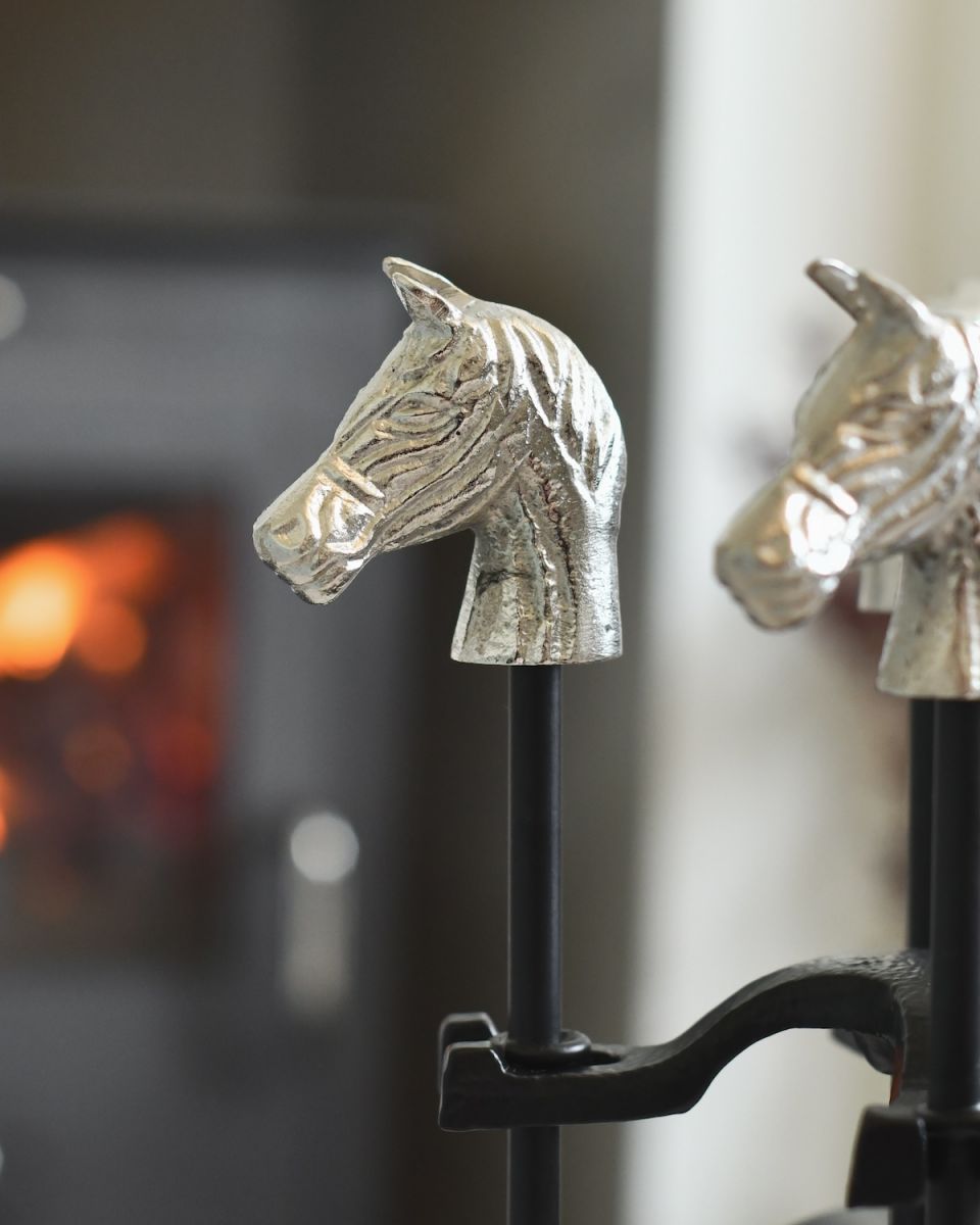 Our statement 'Sawston Stables' Companion Set features four essential fireside tools (brush, shovel, tongs and poker), a must-have for those with wood burners, coal fires, or open fires. ‘Sawston Stables’ features sleek, polished tools with striking silver horse head handles.
