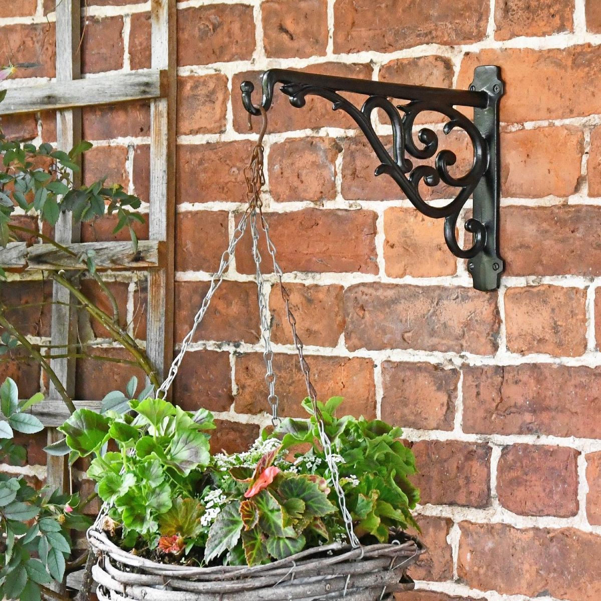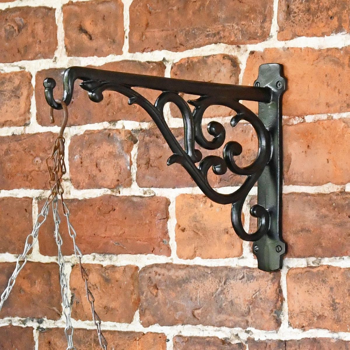 Crafted from high quality aluminium and finished in a beautiful powder coated midnight black finish, this hanging basket bracket is ideal for all gardeners. Delicately detailed with scroll and filigree detailing throughout, the mounting bracket has pre-drilled holes for easy installation to the desired wall or location. Complete with an integrated hook, it allows for a mess and fuss free experience when hanging blossoming baskets. A must have accessory for any green fingered person.