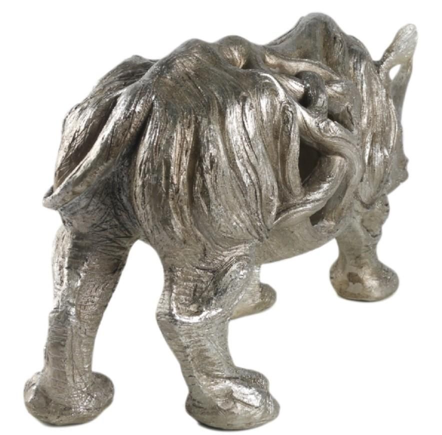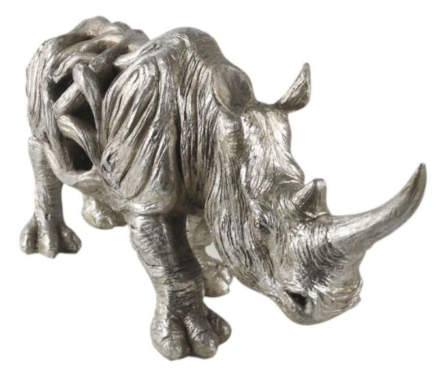 Crafted from resin and finished in a rustic silver effect, this stunning interior sculpture takes its inspiration from one of Africa’s most beloved creatures – the rhino. Authentically detailed throughout as seen its facial expression, horn, and perked ears, this unique design features a hollow interior adorned with branch-like detailing. The perfect indoor ornament for anyone with a love for animals, this rhino ornament would look perfect placed on a cabinet or tabletop.