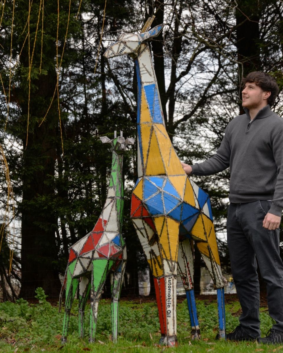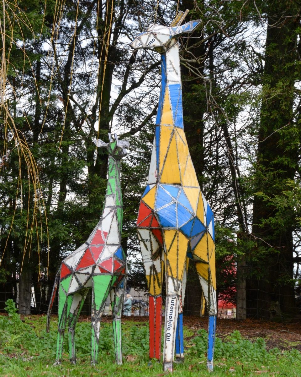 The frame of this geometric giraffe garden sculpture is meticulously crafted from reclaimed oil drums to form a mosaic-like polygonal masterpiece worthy of the Savannah.