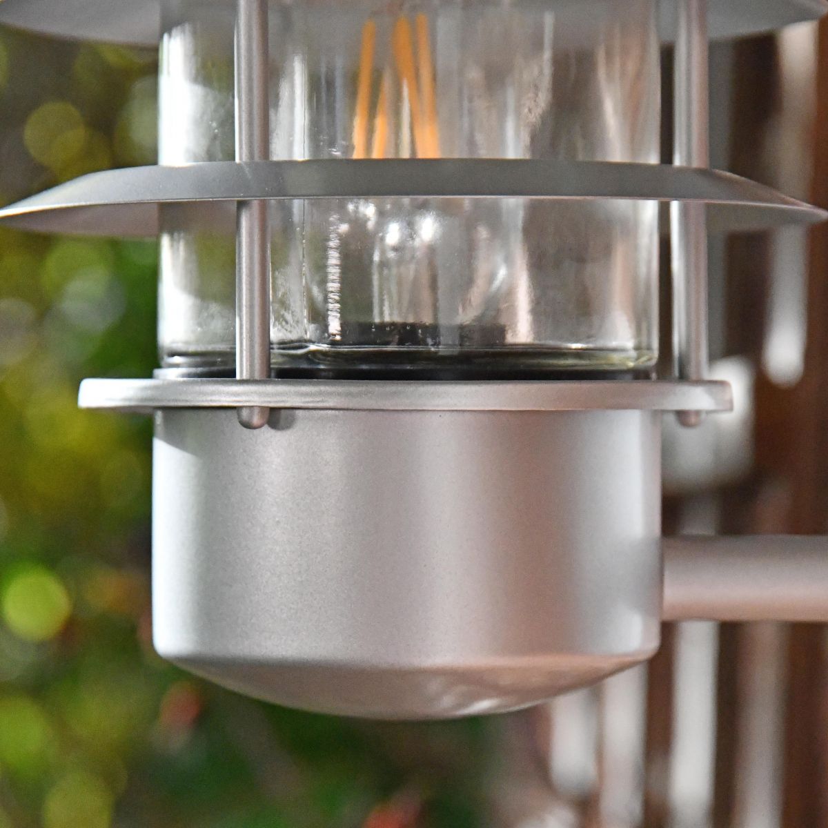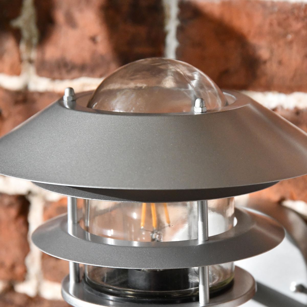 Pre-installed with a PIR sensor, this wall light is the perfect way to bring light to your exterior space whilst adding a true sense of contemporary style. Finished in a sleek silver, this lantern comes complete with a lower-mounted bracket and circular back plate in a matching finish. This lantern beautifully combines nautical design in its cage-like tiers with modern simplicity in its finish and shape. Ideal for mounting next to a doorway or on the outer columns of a porch, this lantern comes supplied with a built-in lower bulb holder for maximum upward light projection.