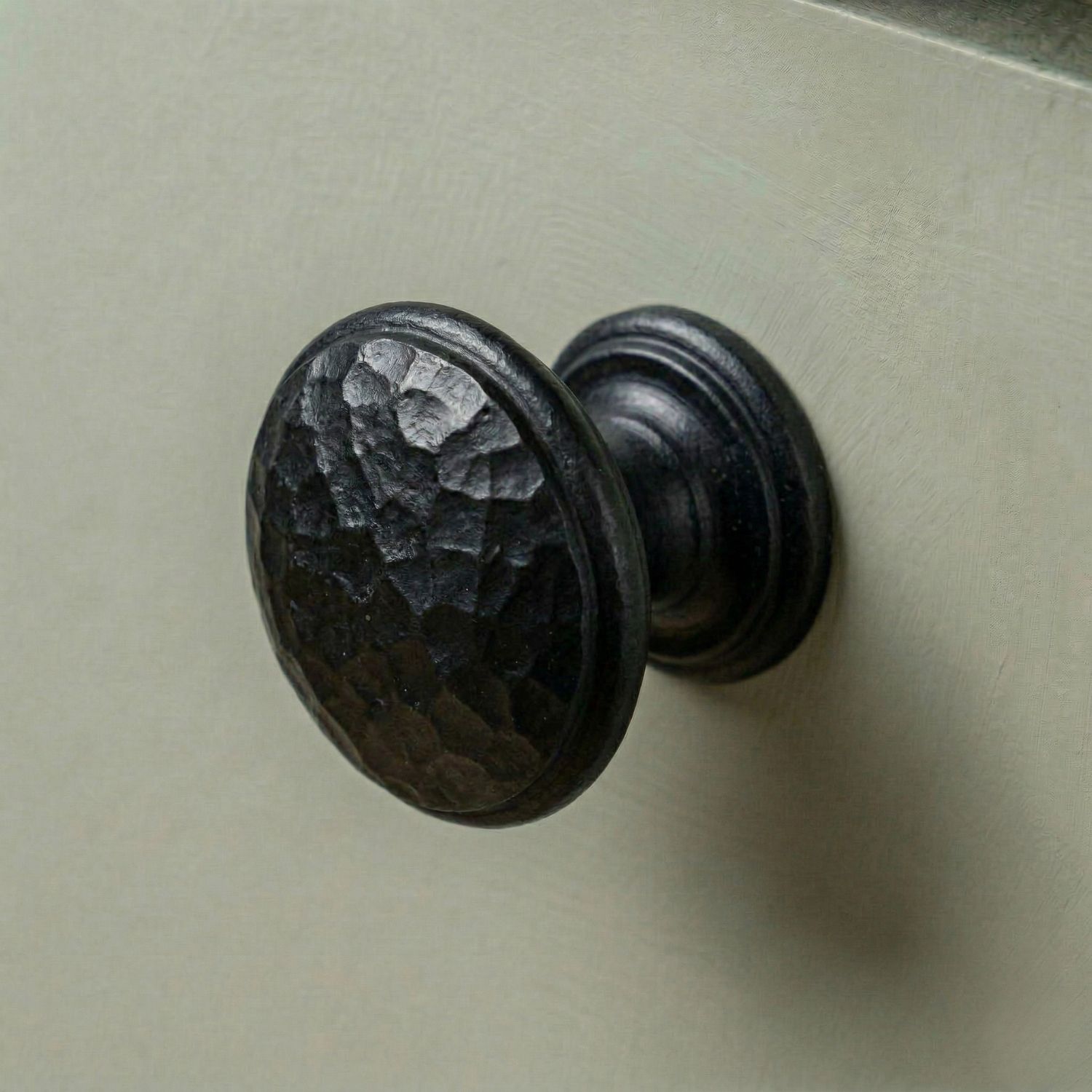 Blackfinish cupboard knob. Made from iron with a blacksmith beaten effect.