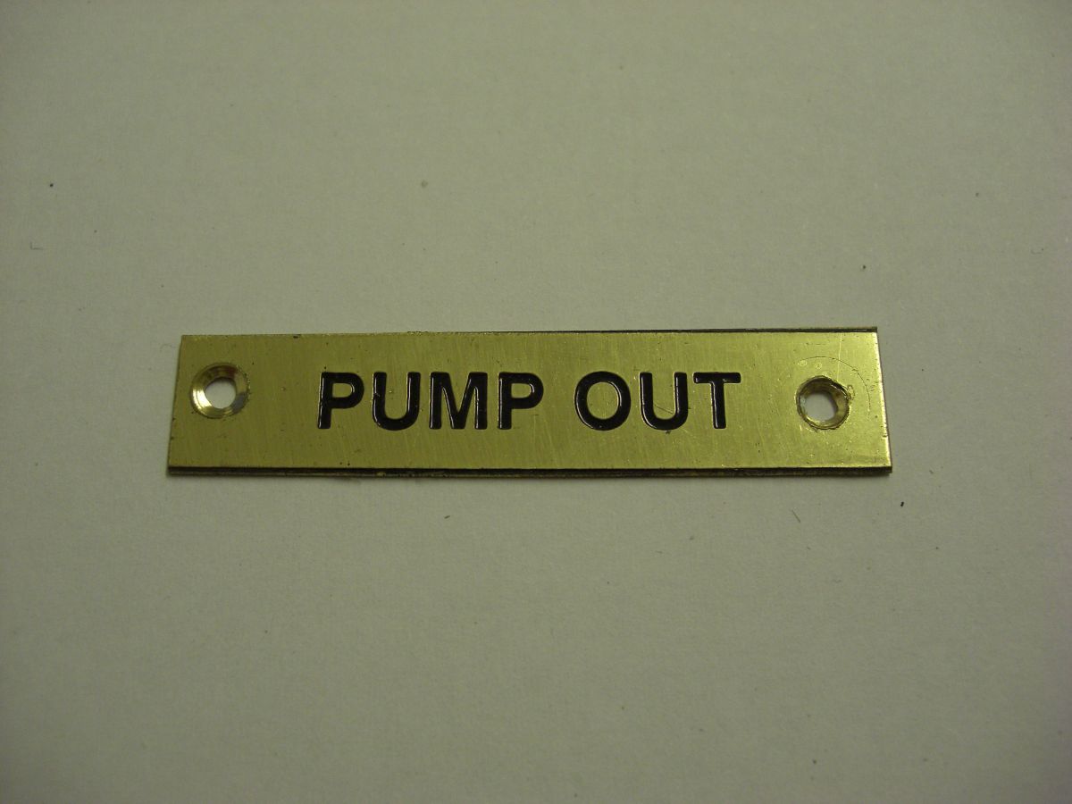This label is made from solid brass sheet with the words "Pump Out" engraved into it and filled in black.