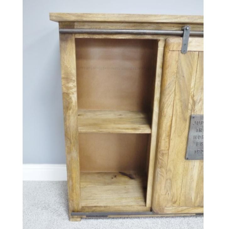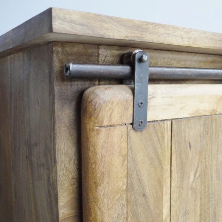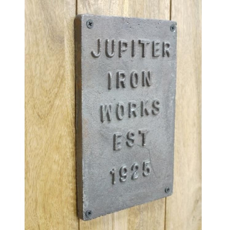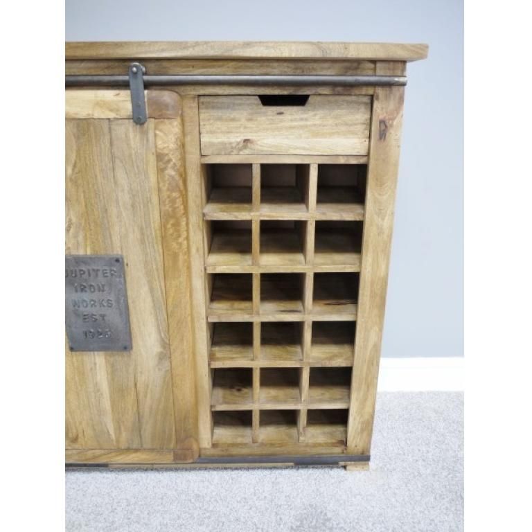 Crafted from solid mango wood, this wine cabinet comes with eighteen wine bottle slots as well as a drawer and sliding cupboard for increased storage. Featuring a plaque that reads “JUPITER IRON WORKS EST 1925”. The product is left in its natural finish, with metal detailing for the sliding door, which adds a degree of authenticity and originality to the piece.