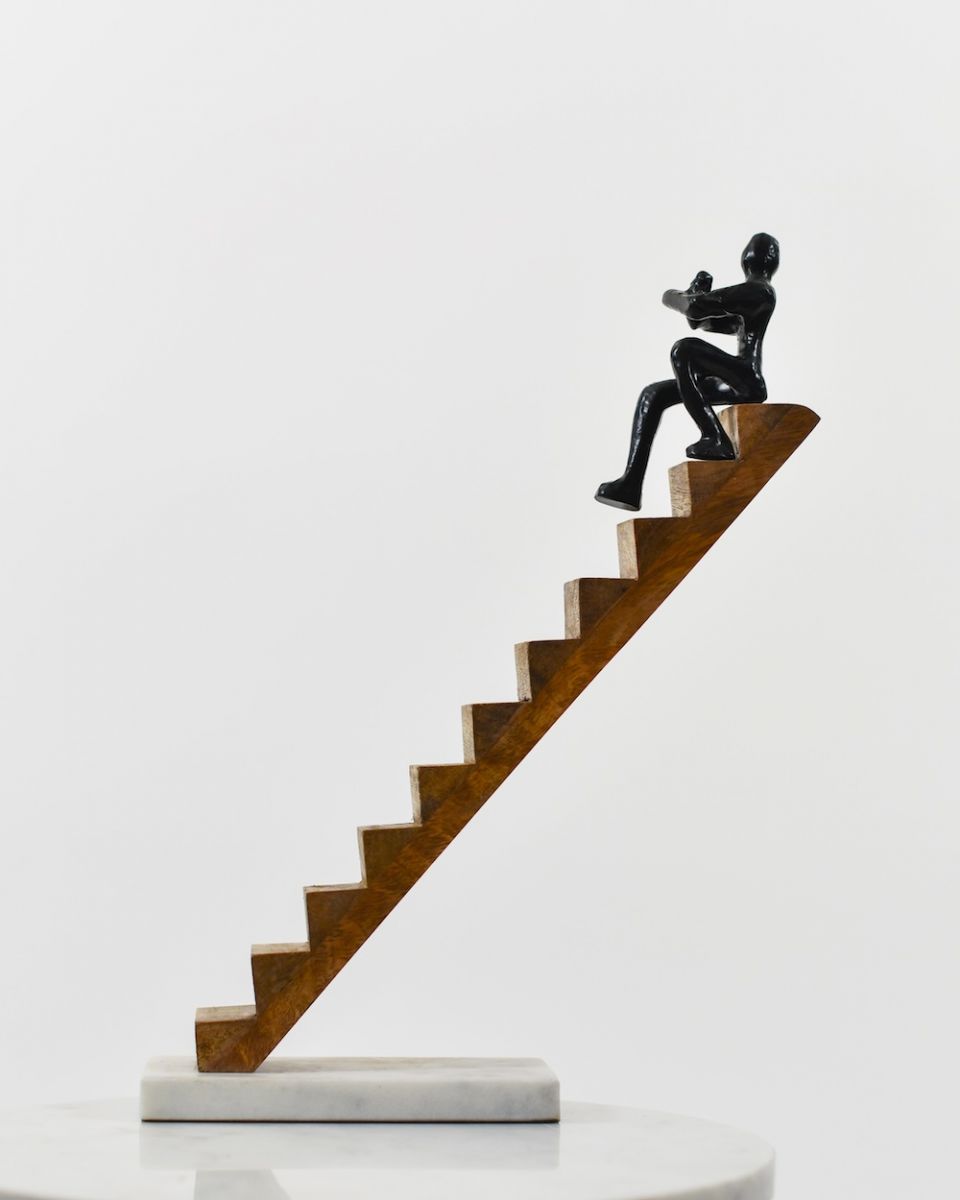 Our handcrafted ‘Solo Conquest’ sculpture is a beautiful addition to any home. Made from high quality cast aluminium, with a solid mango wood staircase and a marble base, it depicts a figure sat at the top of the stairs, reflecting back on his journey.