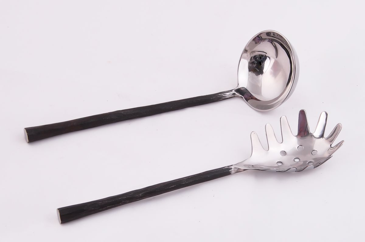 The handles have been left unfinished in their natural steel finish, whilst a bright hygienic, polished finish has been added to the serving ends.