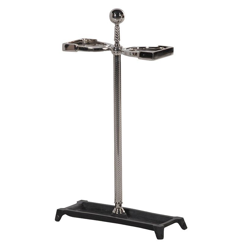 Made from a combination of cast iron and brass, this umbrella stand is contemporary in design yet unique in detailing. Featuring two umbrella holders inspired by riding stirrups, a sturdy four-legged cast iron base, and criss-cross detailing along the bright chrome finished stand, this umbrella stand is both classic and charming. This piece also features a concave base to collect any excess water.