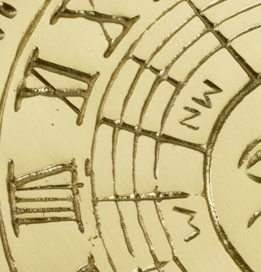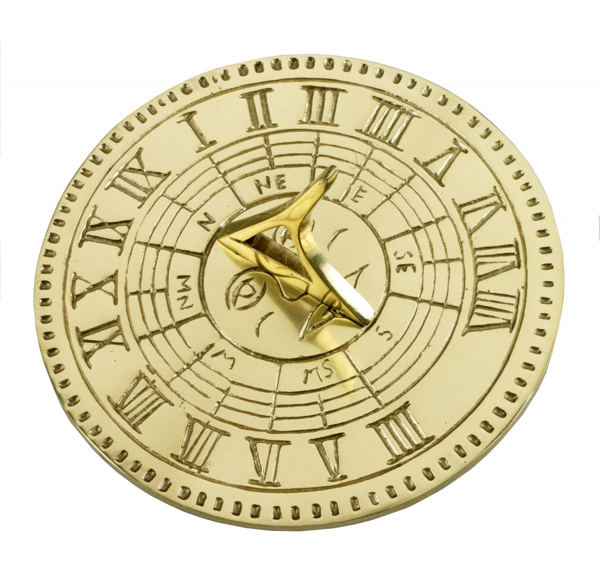 A circular solid brass Sun face Sundial depicting a "sun face" with numerals in Roman characters.