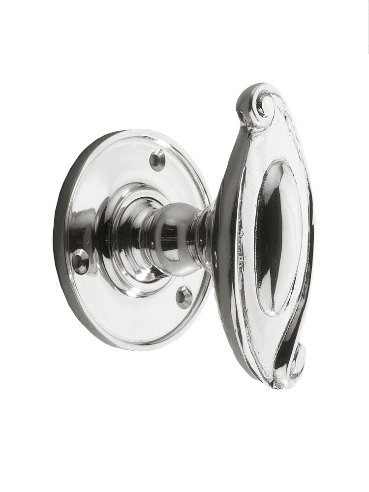 Oval door knob with a swirl design edging and detailed centre. supplied complete with backplates, spindle and fixings.