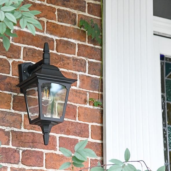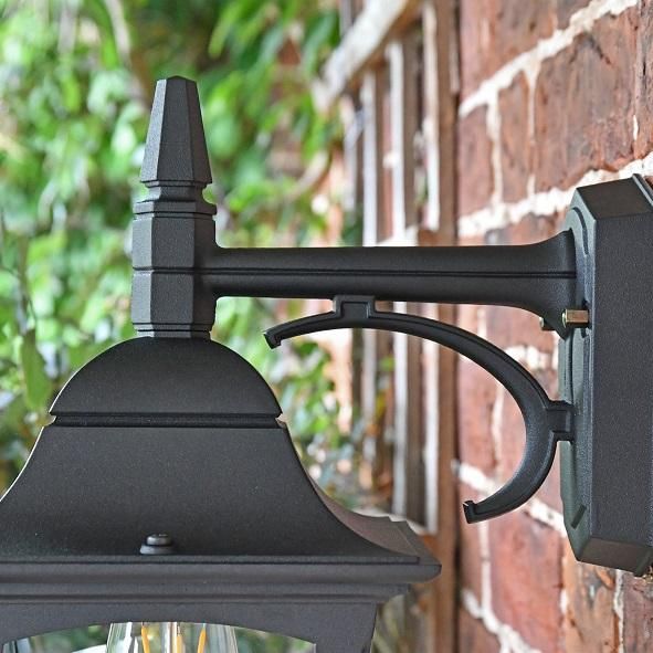 Finished in a sleek midnight black, this simple yet incredibly stylish lantern has been specifically designed for outdoor use and would be ideal mounted above a doorway or entrance. Taking inspiration from traditional Victorian design combined with the modern touch of sharp angles and lines, this lantern is perfect for those who want to stay true to classic design whilst adding a contemporary touch to their outdoor space. This lantern is top-mounted onto a matching bracket and back plate and comes complete with an upper bulb holder for maximum downward illumination.