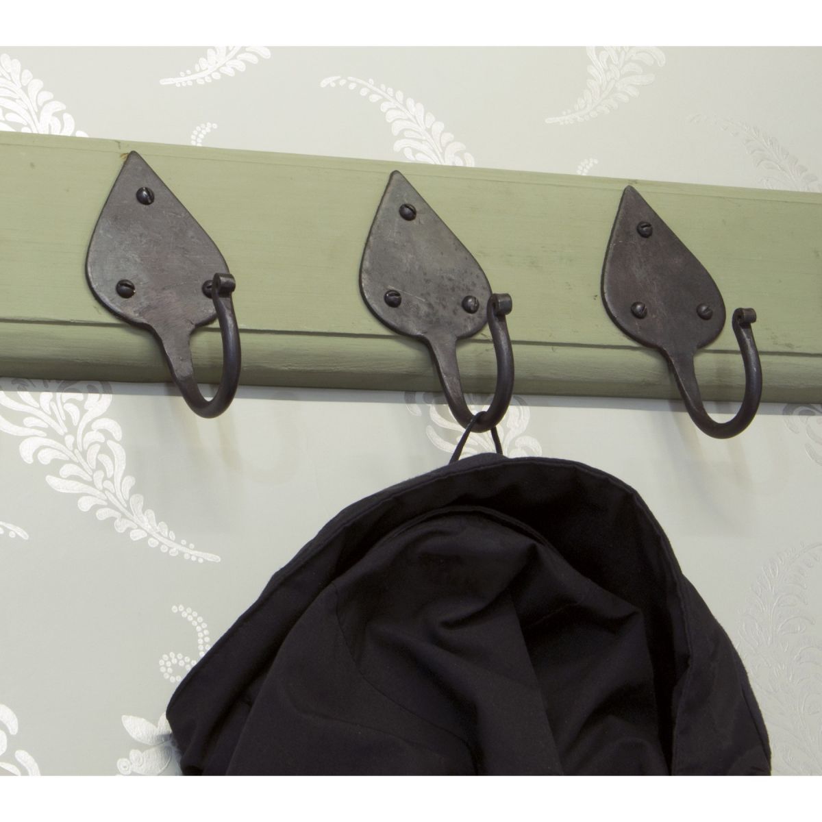 Iron coat hooks finished in a thin coating of natural beeswax to enhance the dark red and blue hues of the metal, and highlight the unique marks left during the forging process. Solid timber backboard in a distressed rustic green for a classic farmhouse style.