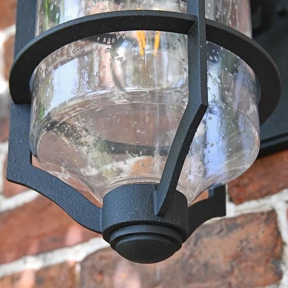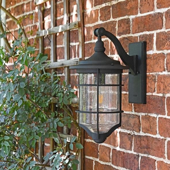 Finished in a speckled black, this lantern comes fitted with a top-mounted bracket and elongated rectangular back plate in a matching finish. Ideal for mounting above a door or entryway, this lantern comes complete with a built-in upper bulb holder and speckled glass dome for maximum downward light projection. This lantern has been inspired by traditional nautical design and will bring a subtle touch of the seaside to the exterior of your home.