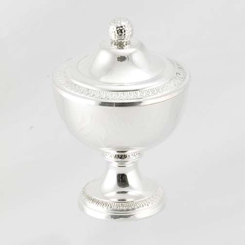 Another regal trophy, with matching lid featuring round bowl, turned stem and plinth base. The lid is finished with a hammered effect ball on the top whilst there is extra detailing around the edges of the lid and base. Hand made in high grade brass, and finished with our delightful silver plate.