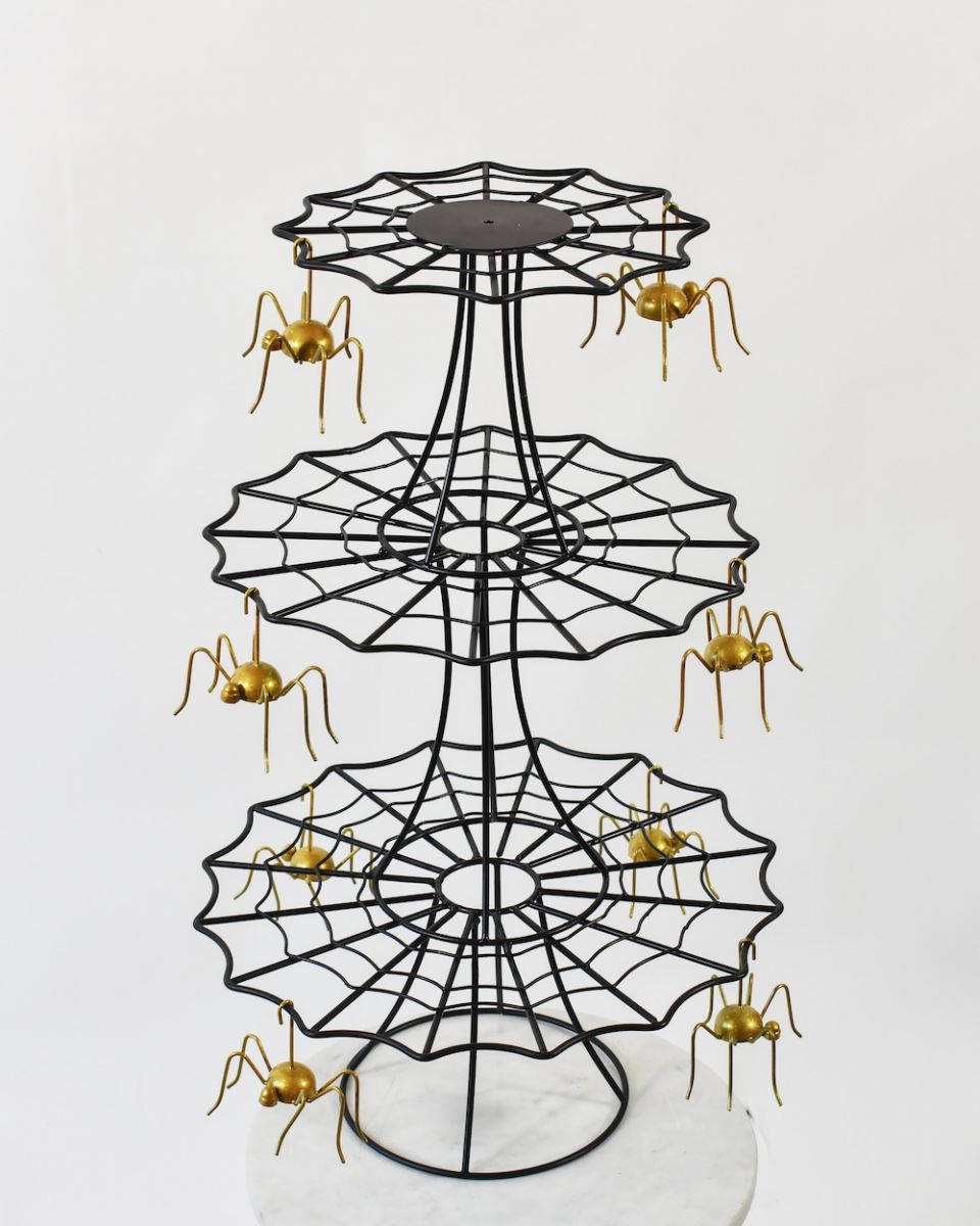 This delightfully spooky three tier cake stand is the perfect centrepiece for any dinner party! Made from a sturdy metal complete with a midnight black finish, it also has completely moveable spiders, finished in a striking gold. Place them wherever best compliments your cake and watch as your dessert becomes the main attraction.