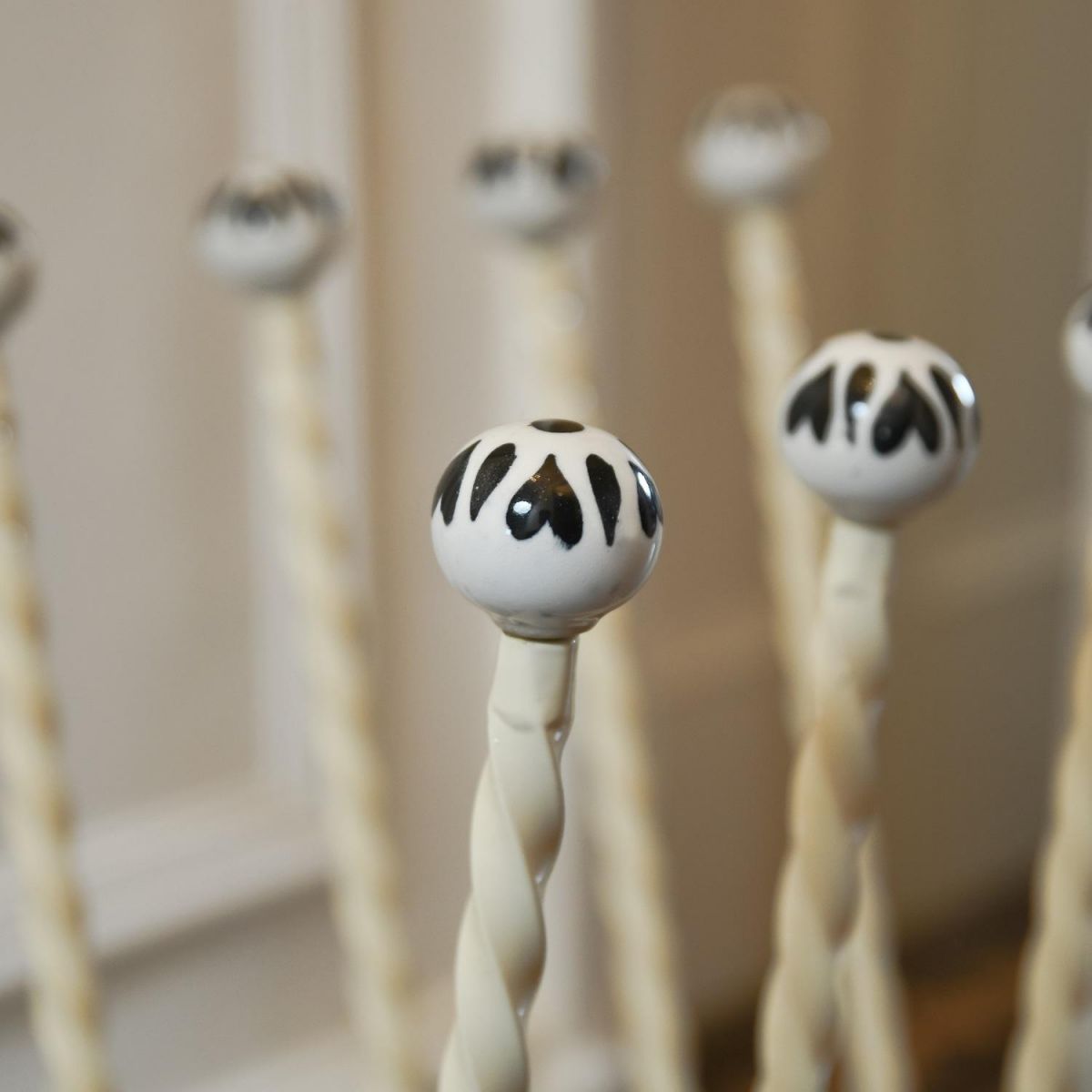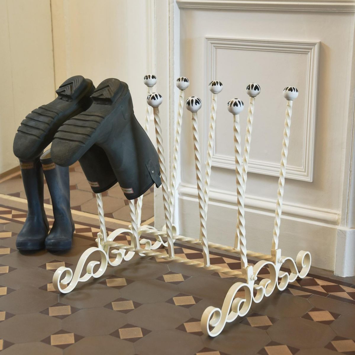 Robustly made in iron, this unique design comfortably stores five pairs of adult sized boots. The stand has an antique cream finish and has been fitted with matching ceramic finials which help to keep your wellies in place. The slanted, V like shape of the rack ensures wet or muddy boots remain separated but neatly stored.