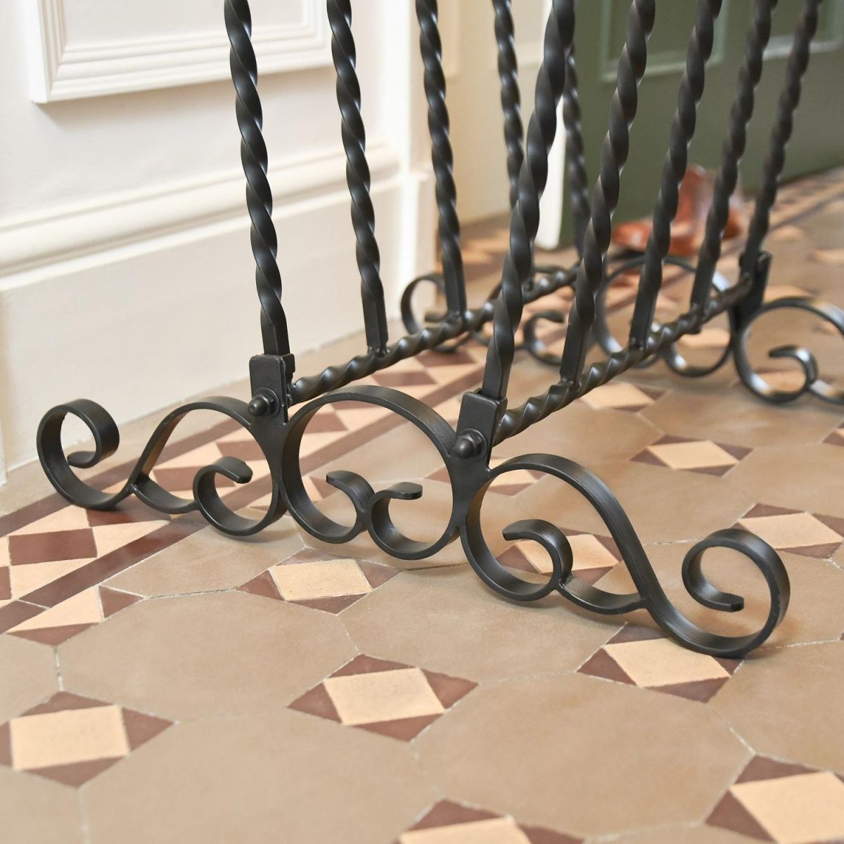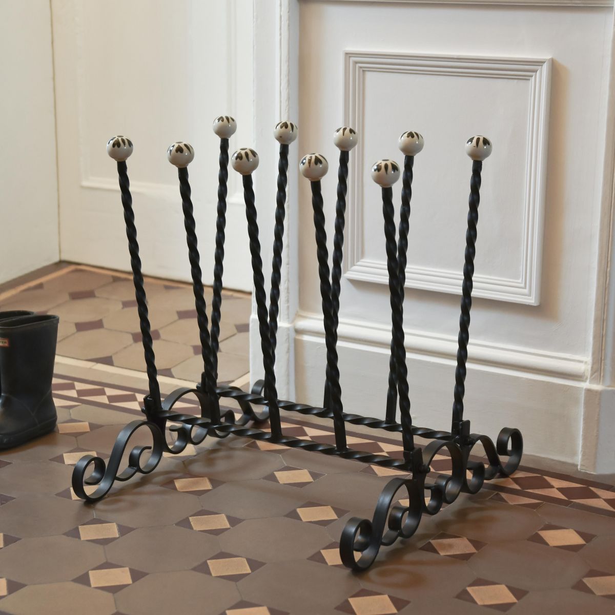This classically styled boot rack is ideally placed at your front door or within the porch, encouraging family and visitors to remove muddy wellies before entering the house. The stand is made in robust wrought iron which is forged and shaped by hand to create the timeless twisted like detailing. A more durable and easy to care for alternative to traditional wooden styles, the rack comfortably holds up to 5 pairs of adult boots.